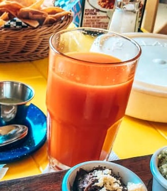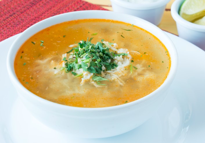 Servido con pollo deshebrado, arroz rojo y cilantro.