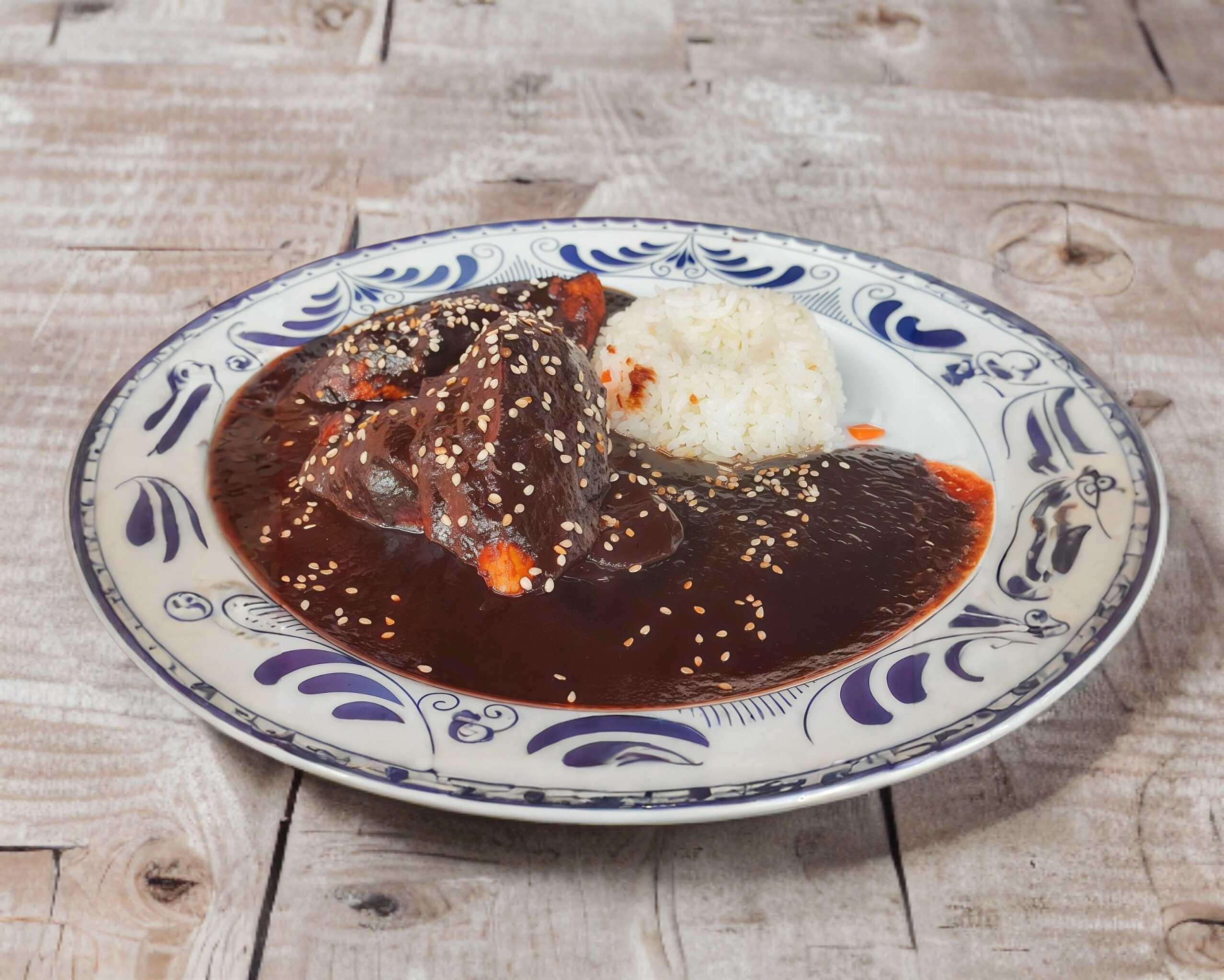 Pierna y muslo bañados de mole con arroz rojo y ajonjolí.
