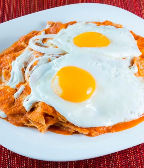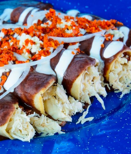 Tres tortillas ligeramente fritas, rellenas de huevo, bañadas en salsa de mole, queso fresco y aros de cebolla.