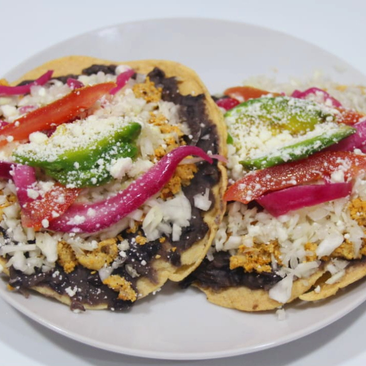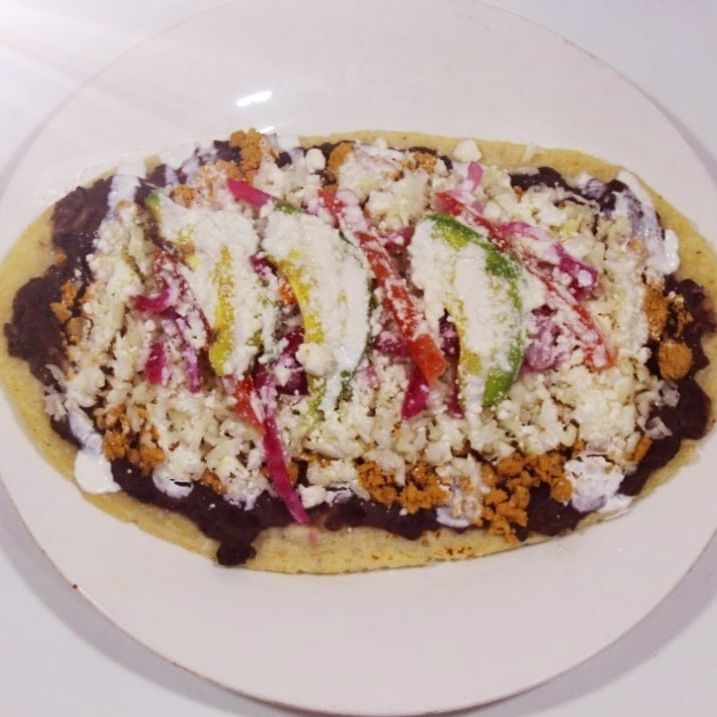 Tortilla moldeada al comal, por encima frijol, guiso a elegir, cebolla curtida, aguacate, queso sopero y media crema.