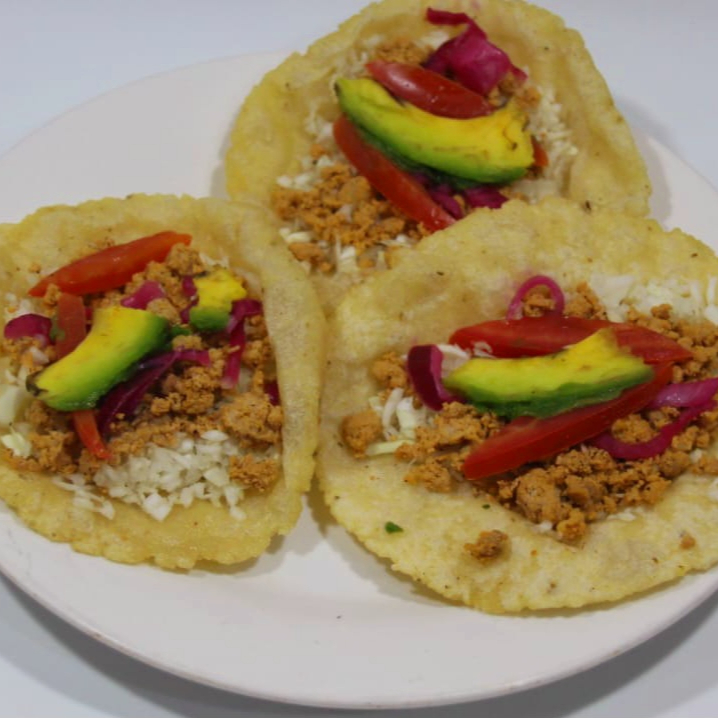 Tortilla frita por encima lleva repollo guizo a elegir aguacate, tomate y cebolla curtida.