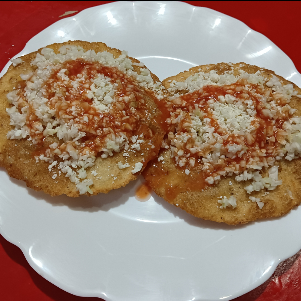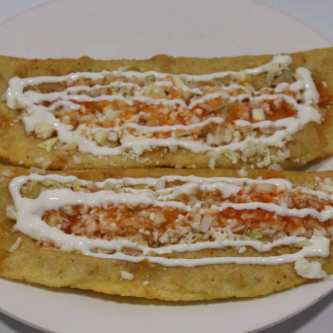 Dos tortillas de maíz fritas rellenas de frijol y guiso a elegir, por encima col Blanca, salsa, queso sopero y unas tiras de cebolla curtida.
