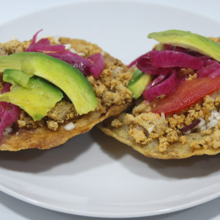 Tortilla de maíz frita, por encima frijol, guiso a elegir, cebolla curtida, tomate y aguacate