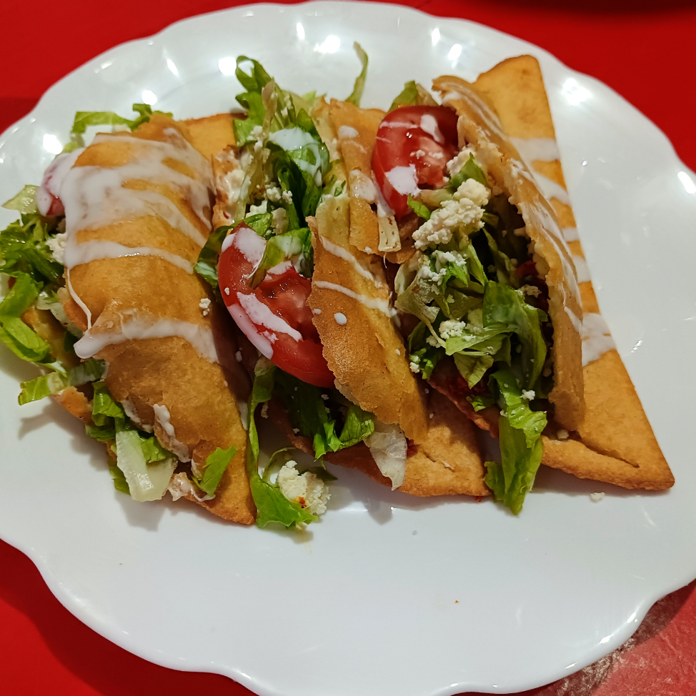 Tortilla frita, rellena de pollo, por encima lechuga