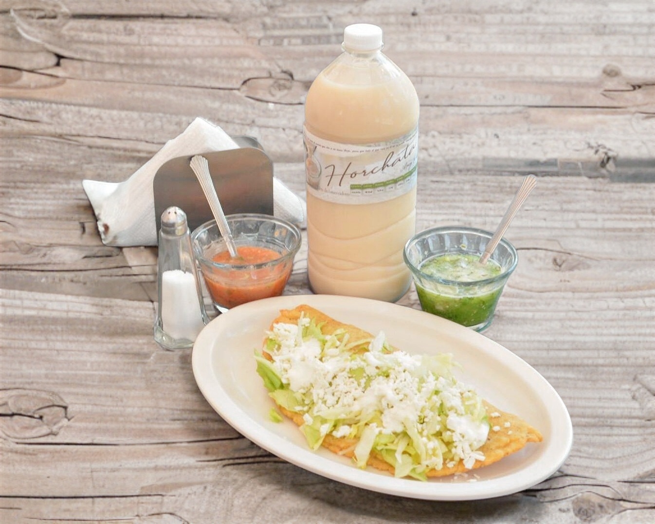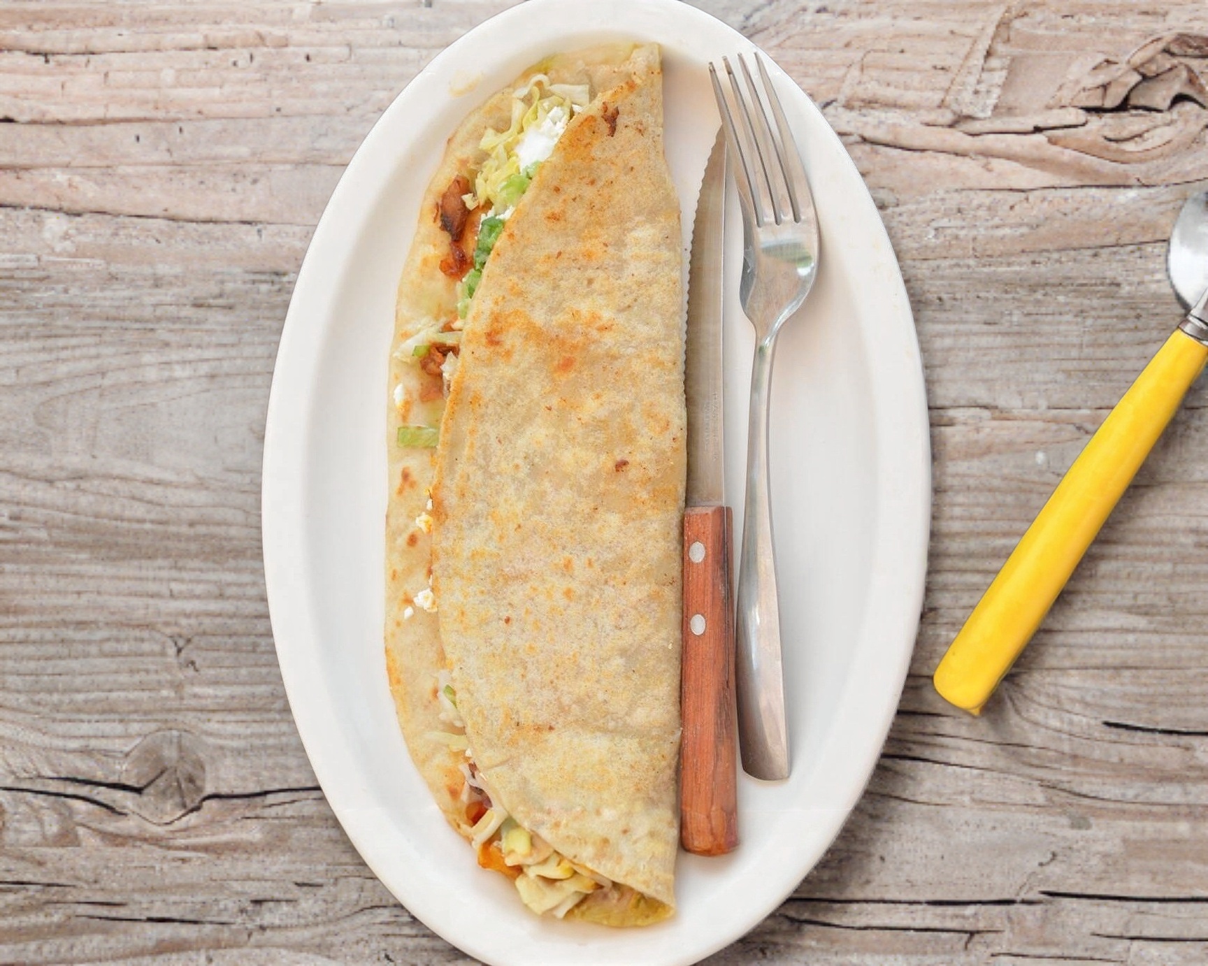 Tortilla hecha a mano, queso oaxaca, guiso a elejir y lechuga , queso y crema.