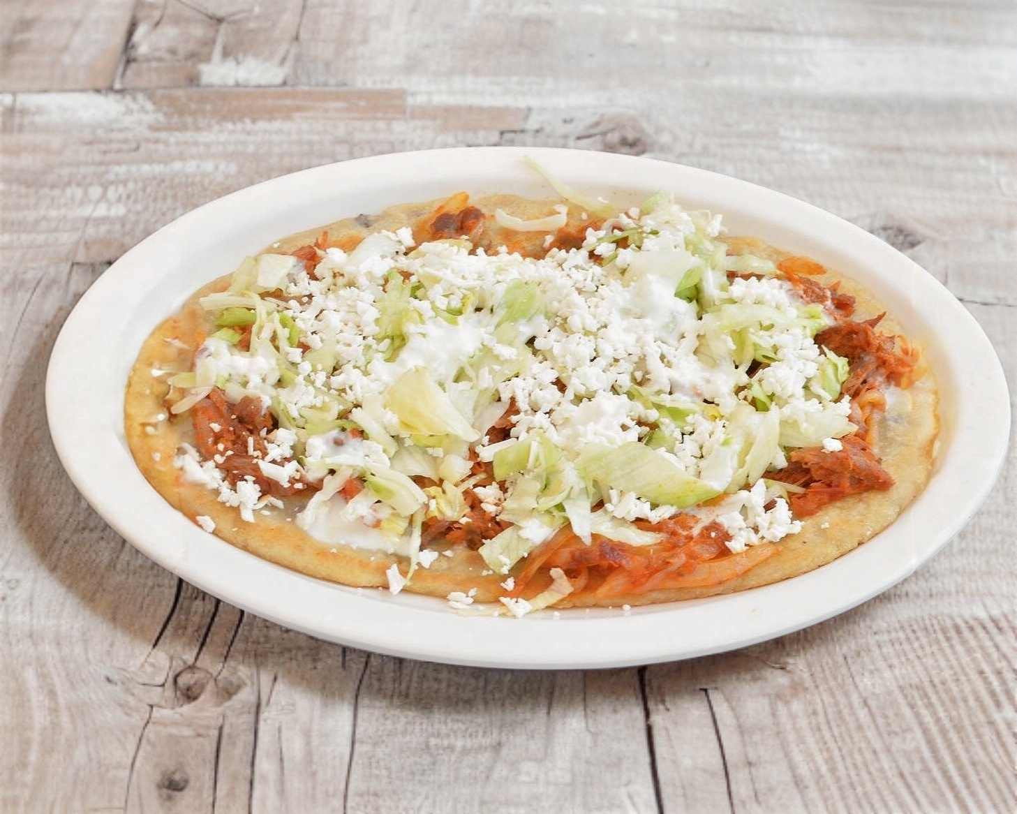 Tostada con una base de frijol el guiso a elegir con lechuga, queso y crema