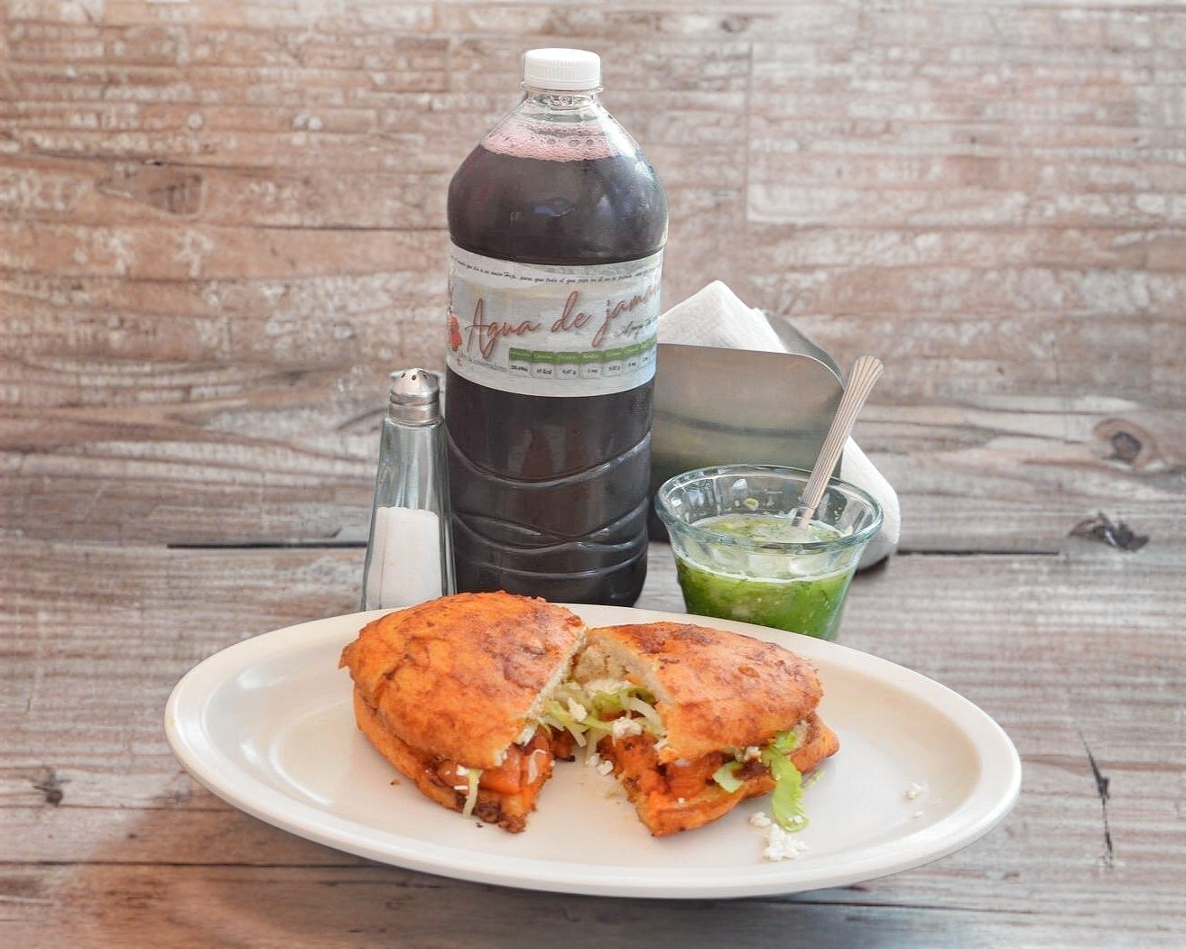 Pan estilo pambazo remojado en salsa de chile guajillo relleno de papa con chorizo con lechuga, queso y crema