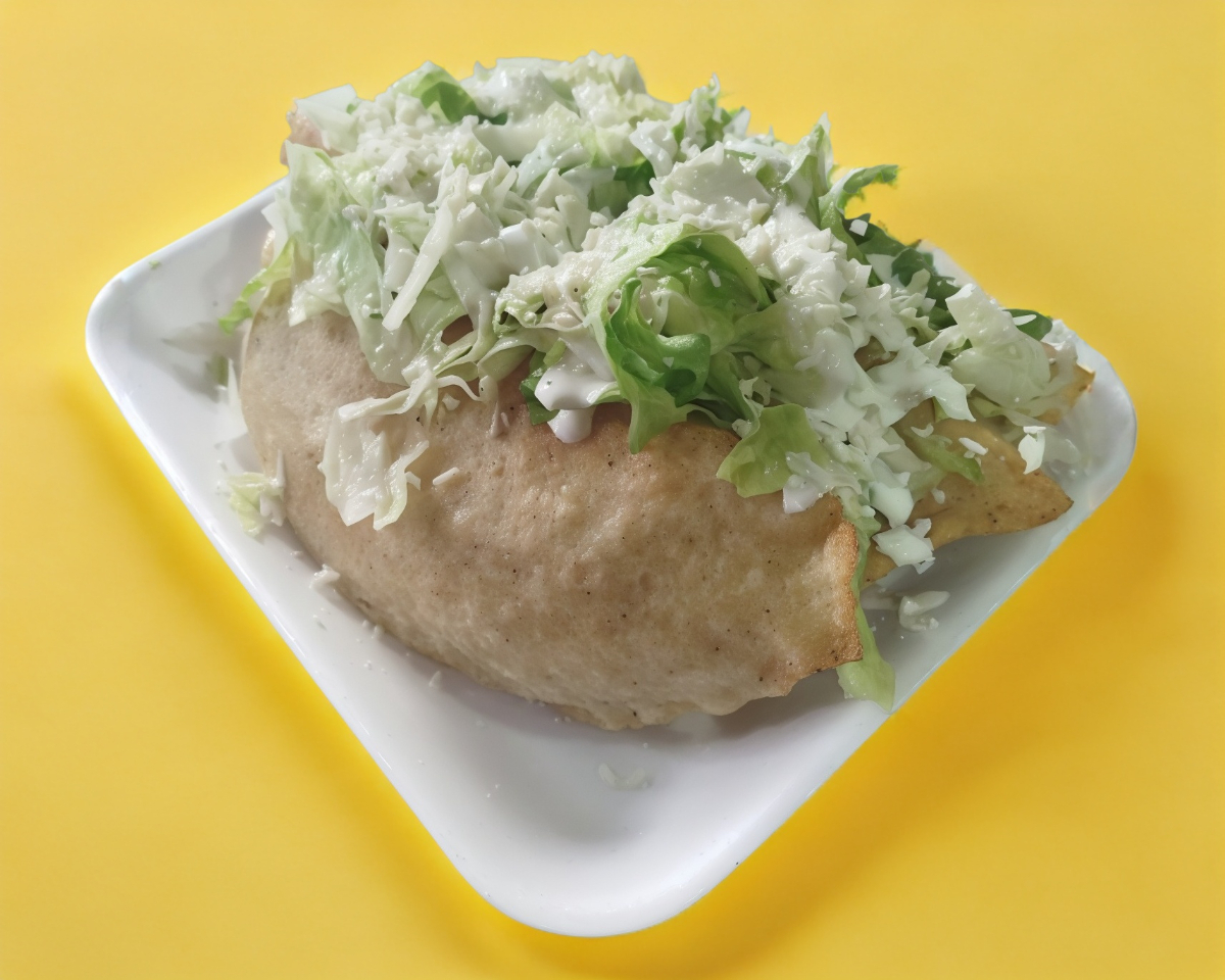 Tortilla en forma de media luna, rellena de pollo, frita en aceite; lleva lechuga, crema y queso.