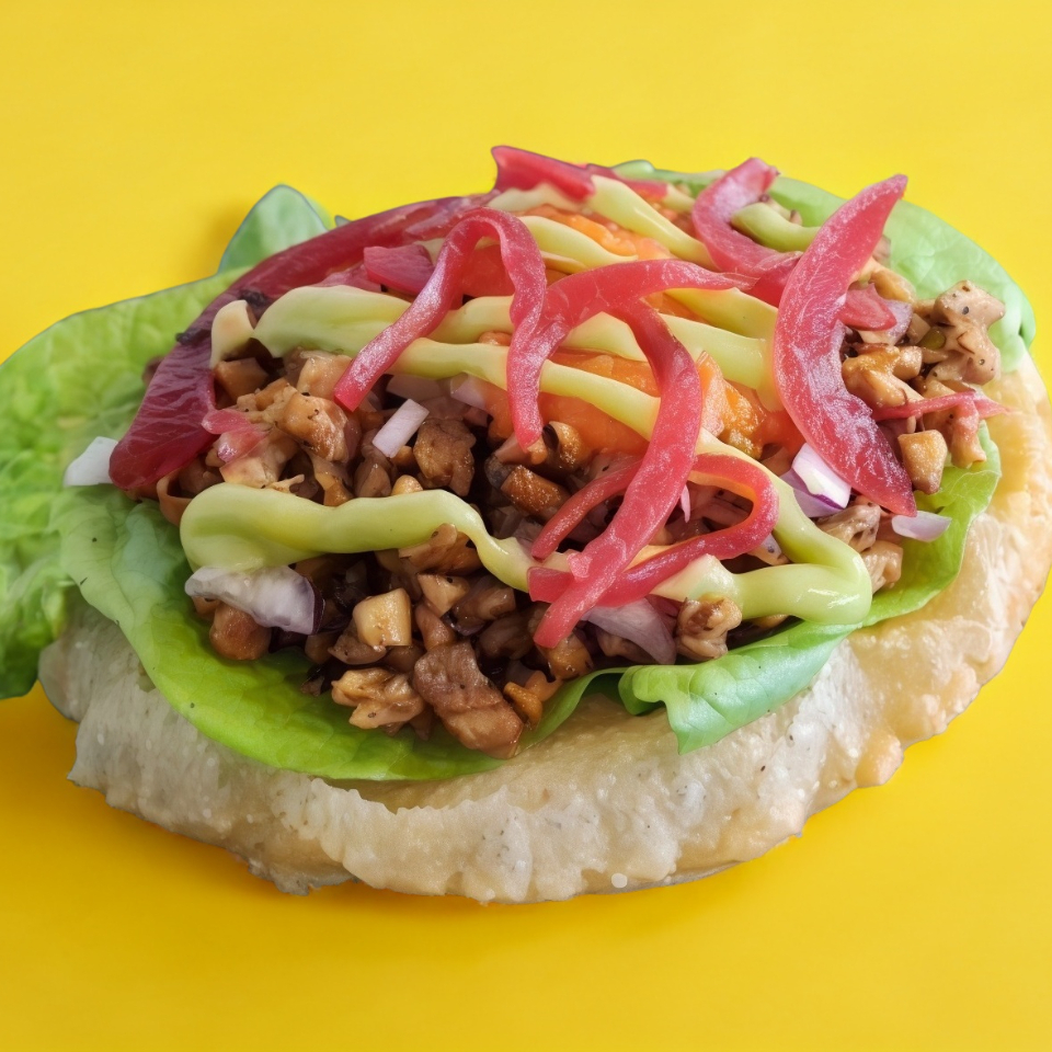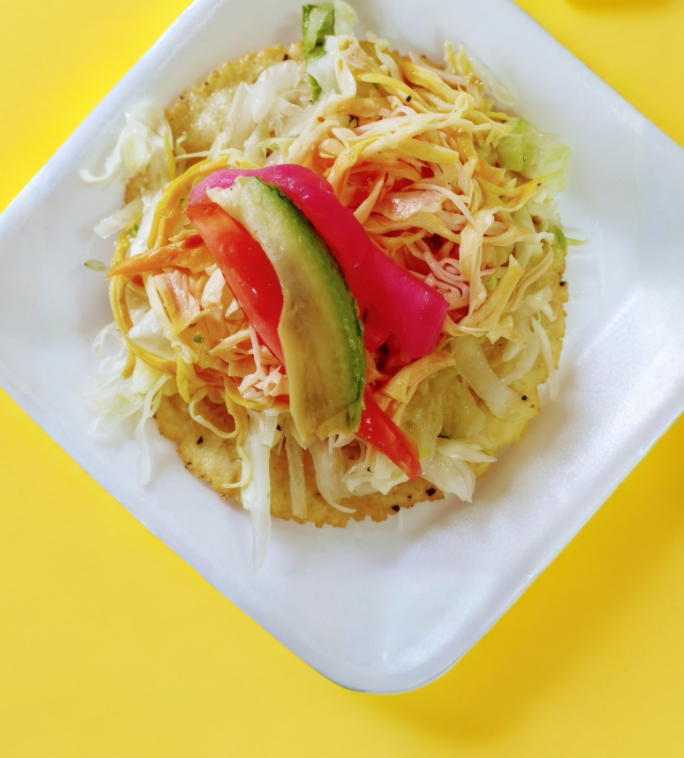 Tortilla hecha a mano frita en aceite; lleva lechuga, pollo, tomate, cebolla y aguacate.