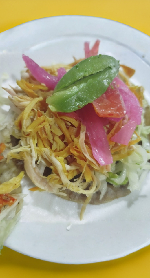 Tortilla de masa hecha a mano (picadita en la orilla); lleva frijol, pollo, lechuga, crema y queso espolvoreado.