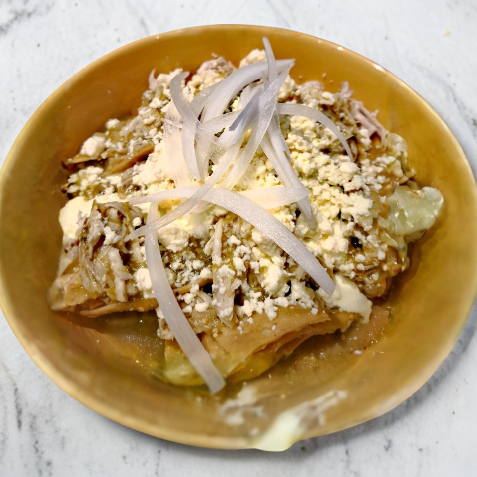 Deliciosos chilaquiles bañados con una rica salsa verde y acompañados de queso, cebolla y crema 1 Porción individual