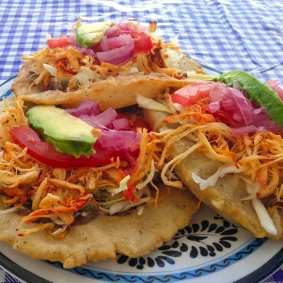 esta hecha de una tortilla frita infladita algo suave, de base lleva carne de pollo luego se le agrega fruta fresca como repollo, tomate, cebolla y aguacate