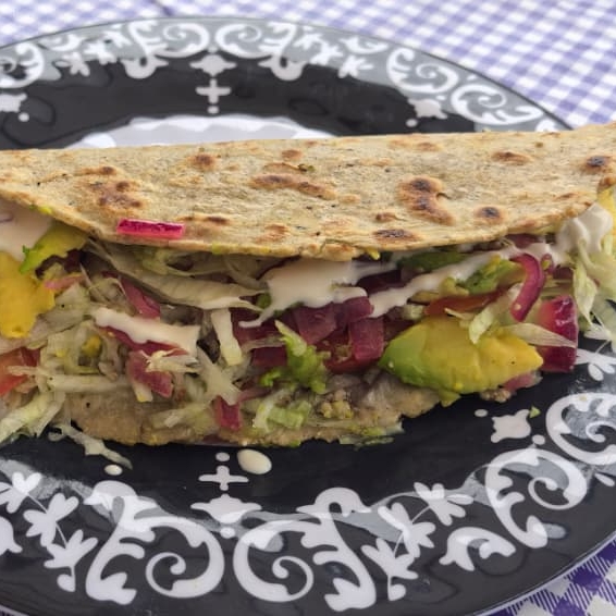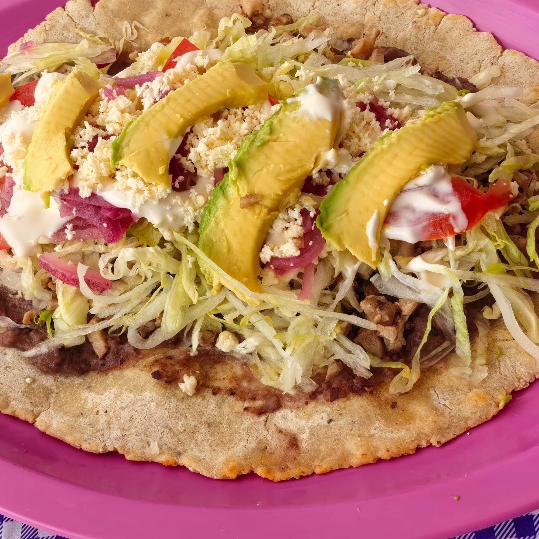 tortilla de masa 100% de maiz lleva una base frijol y queso oaxaca encima lleva carne asada de puerco se le agrega verdura fresca como lechuga, tomate, cebolla,aguacate por ultimo se le pone media crema y queso fresco