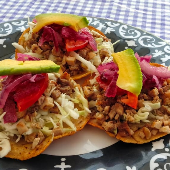 esta hecha de una tortilla frita con textura tostada de base lleva frijol se le agrega carne asada de puerco, luego se le pone verduras frescas como lechuga, tomate, cebolla, aguacate y por ultimo media crema y queso fresco