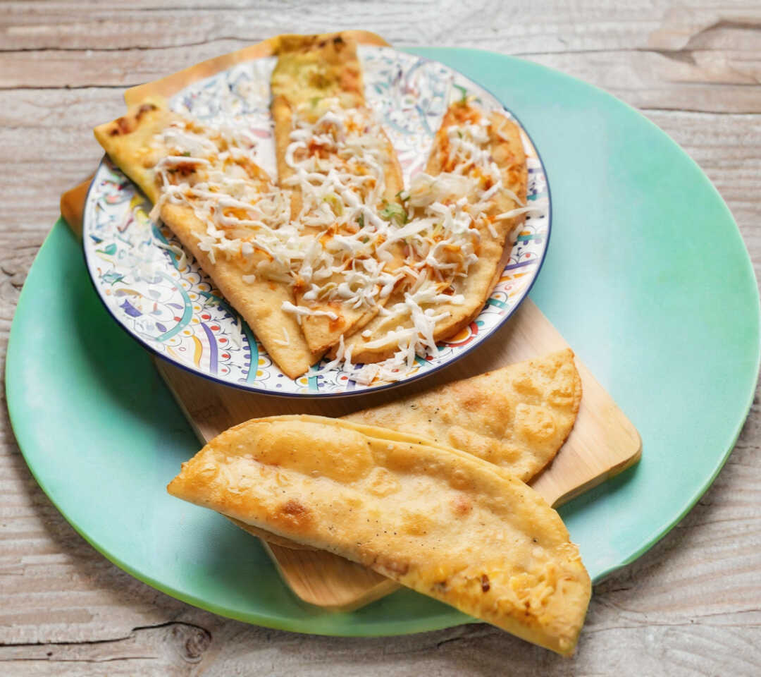 Quesadilla hechas a mano de tinga de pollo y queso oaxaca acompañada de lechuga fresca y crema