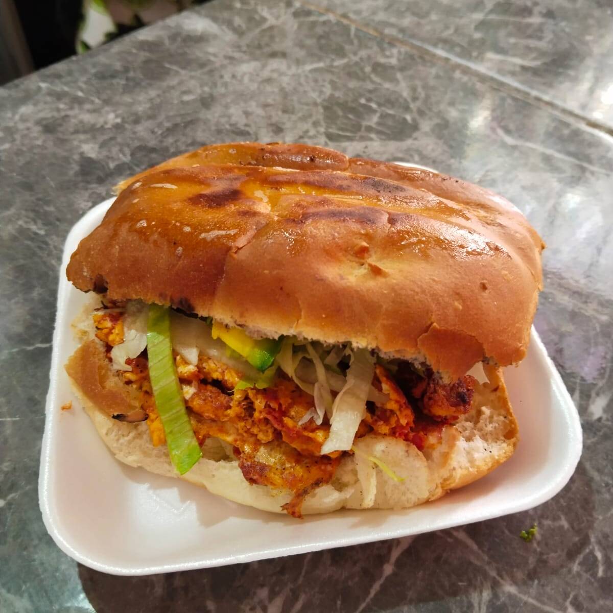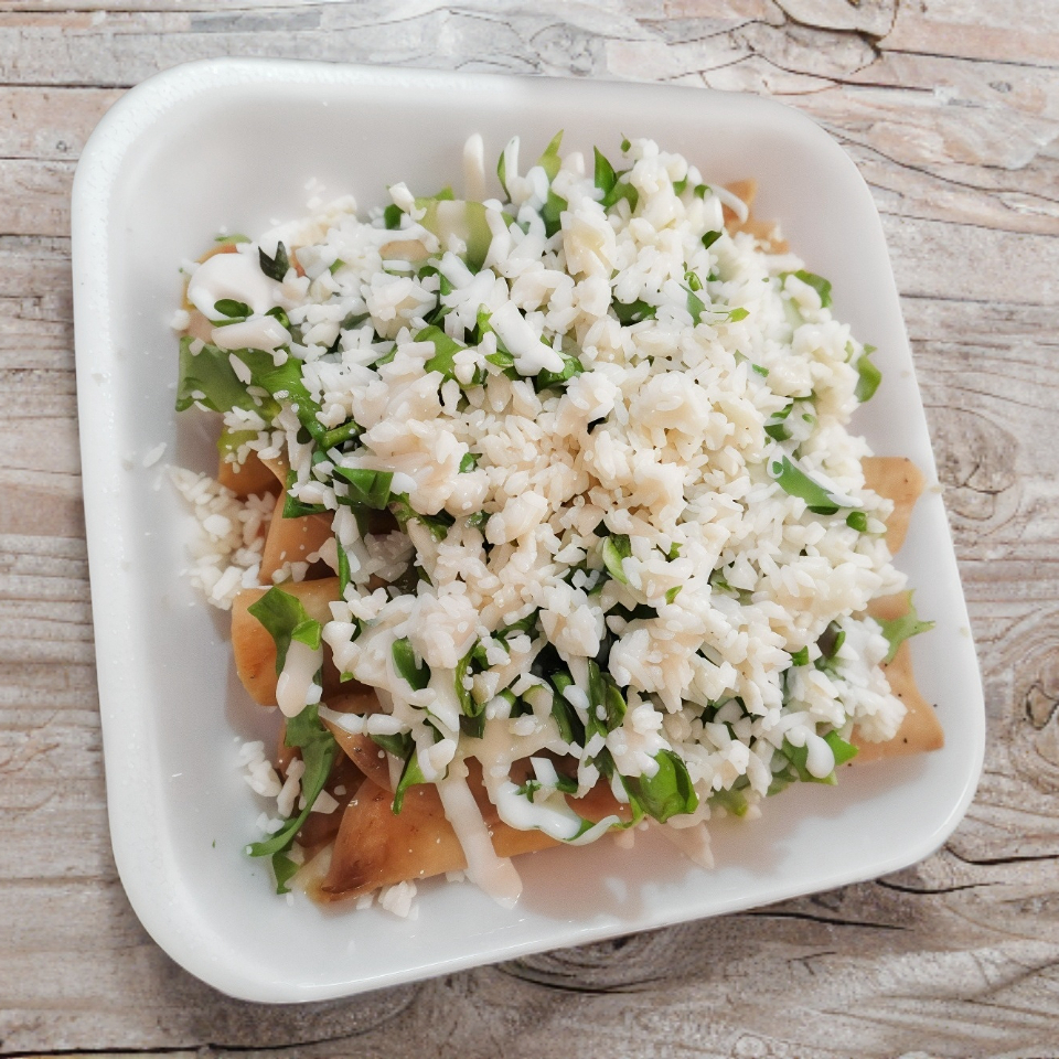 Empanada hecha con masa fresca y pollo en tinga recien elaborado acompañada de lechuga fresca, crema y queso sopero de la mejor calidad