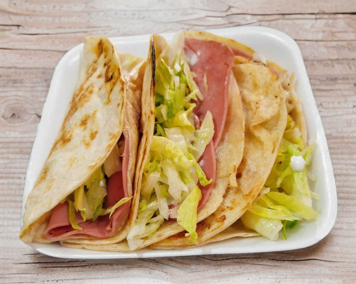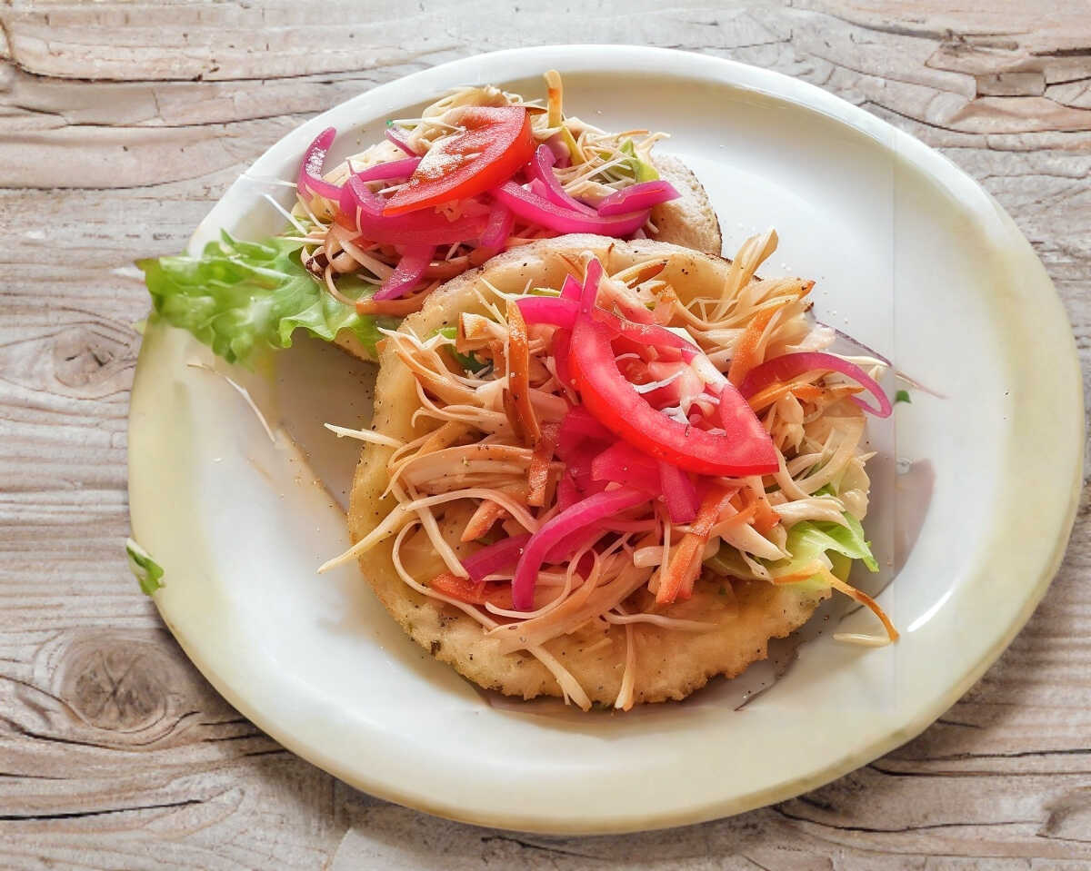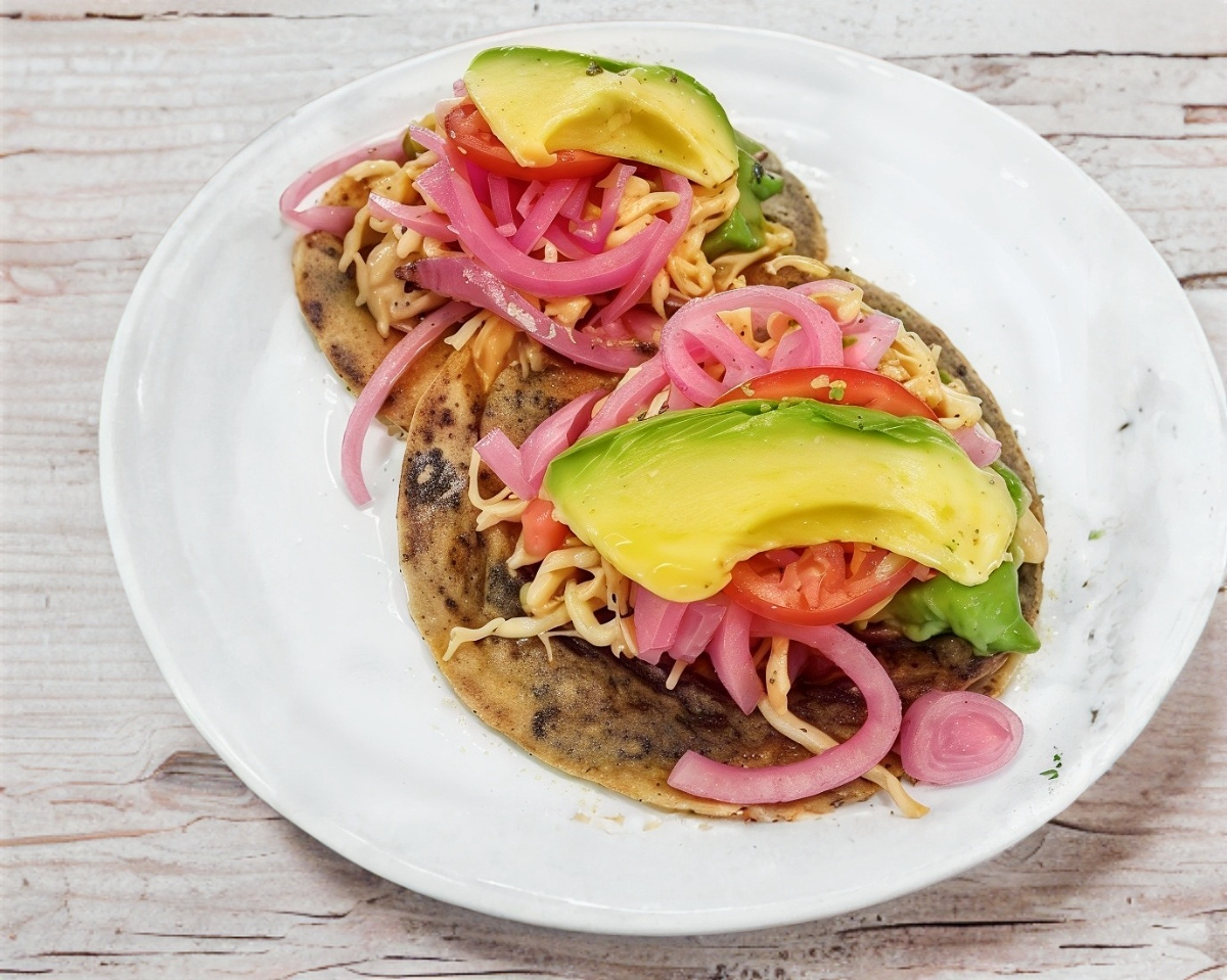 TORTILLA DE PANUCHO RELLENA DE FRIJOLITO CON GUISADO DE CHICHARRON PRENSADO ACOMPAÑADO DE LECHUGA,CEBOLLA MORADA TOMATE Y AGUACATE