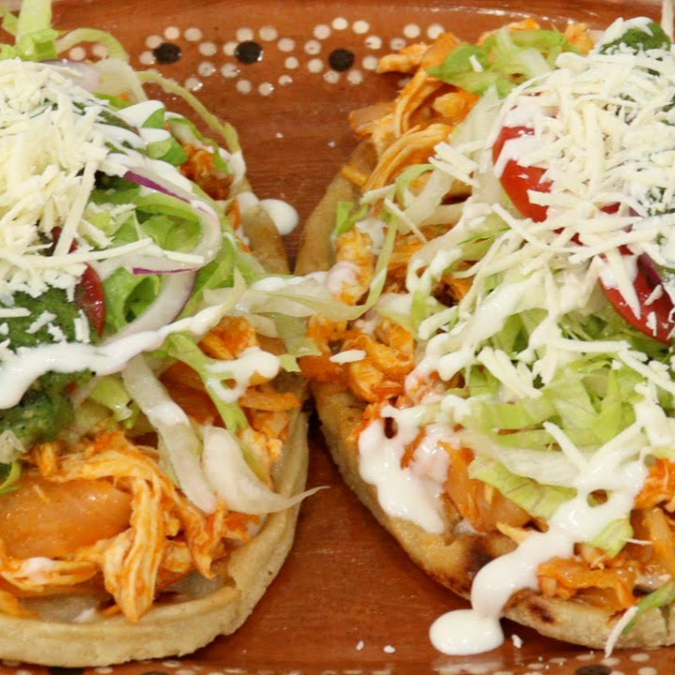 SALBUTE DE TINGA DE POLLO HECHA A MANO ACOMPAÑADO CON CEBOLLITA MORADA, TOMATE, LECHUGA Y AGUACATE