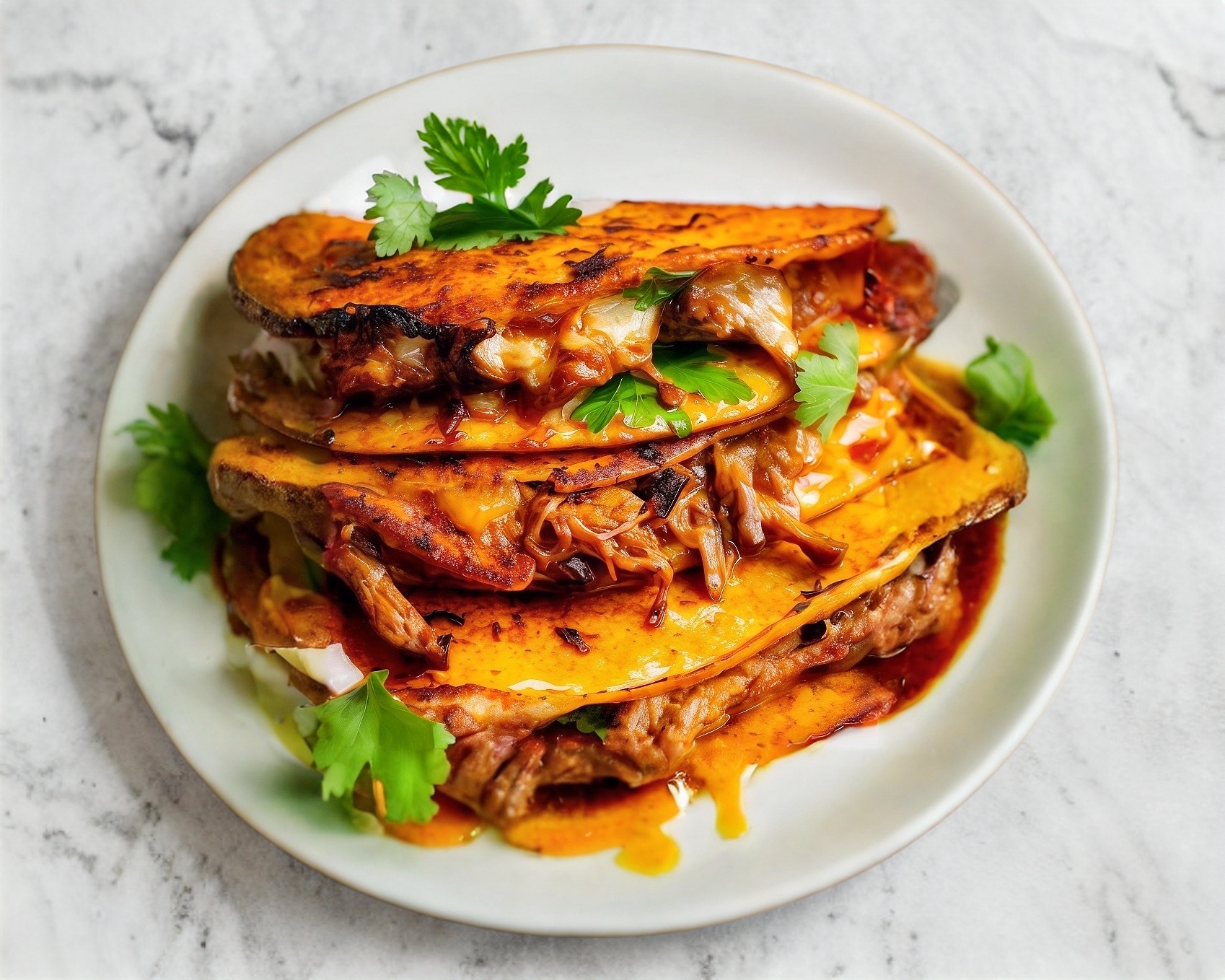 Tortilla de maíz, rellena de queso, guisada con tinga, hongos, papa, calabaza y huitlacoche.