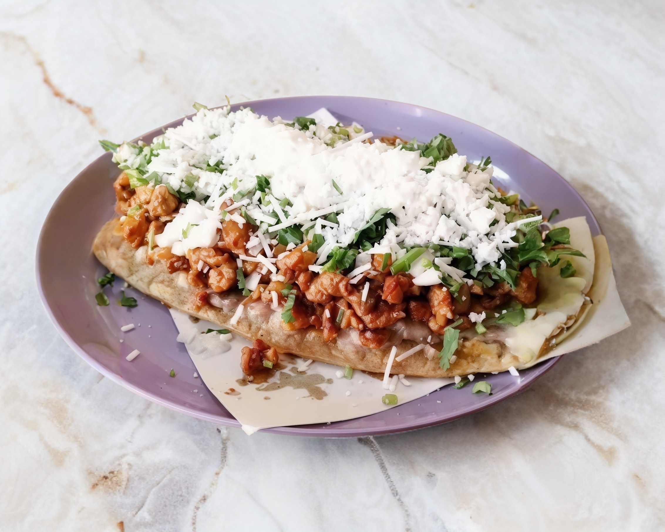 Sope grande con frijol, queso oaxaca, lechuga, crema, queso fresco y guisado a elegir.