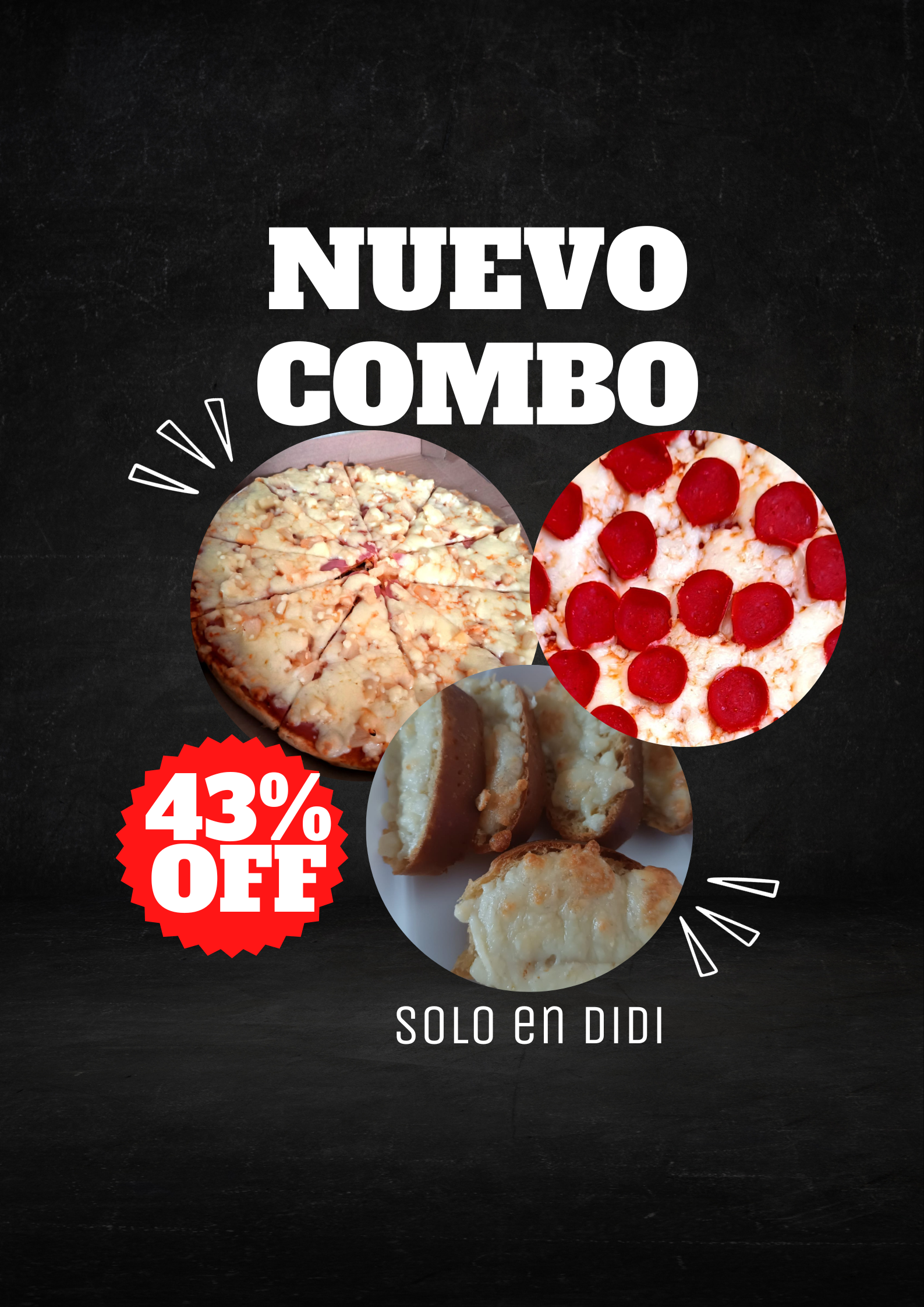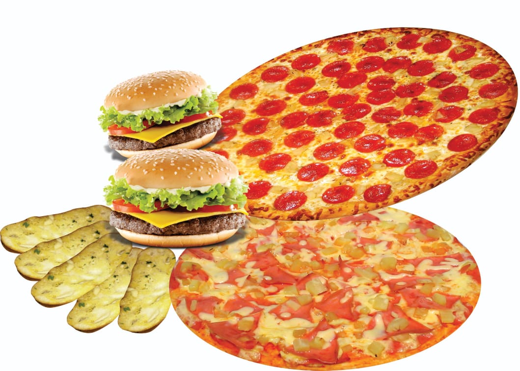 2 hamburguesas , 2 pizza ( 3 ingredientes a escoger ) , 5 piezas de pan