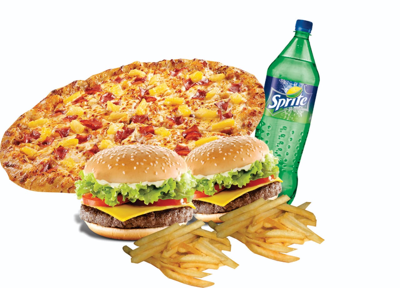 1 PIZZA LIBRE*1 + REFRESCO 1.50ML*1 + 2 HAMBURGUESAS CON PAPAS Y QUESO*1