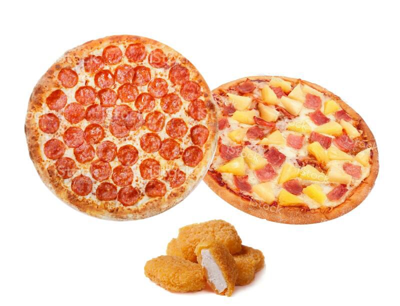 Dos pizzas grandes de 2 ingredientes a elejir más 9 nuguets de pollo
