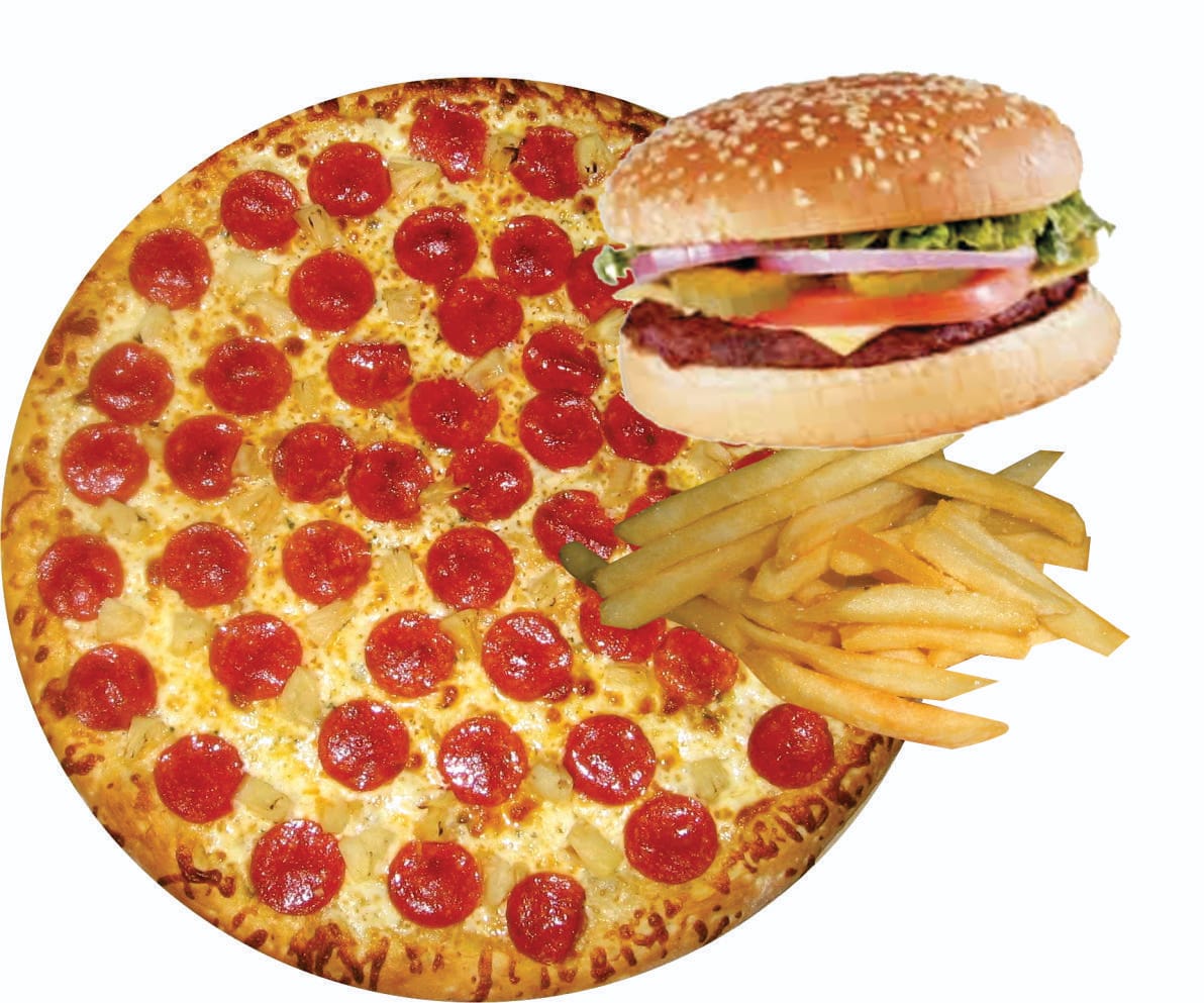 1 hamburguesas con papas fritas y 1 pizza grande ( 3 ingredientes a escoger )