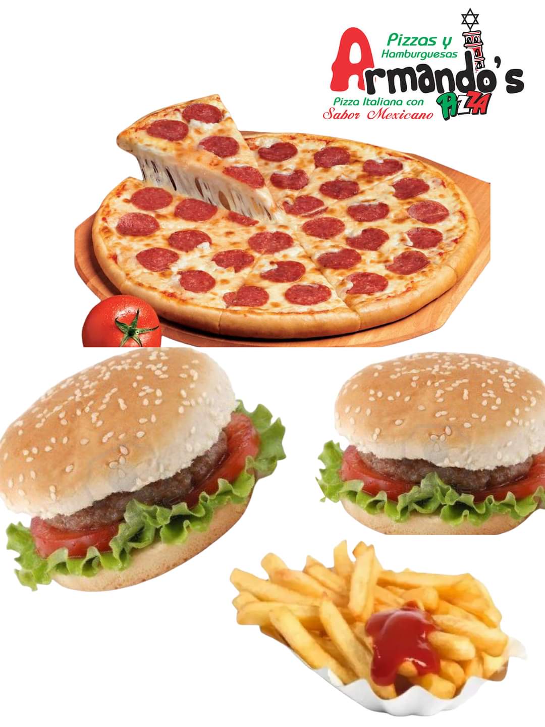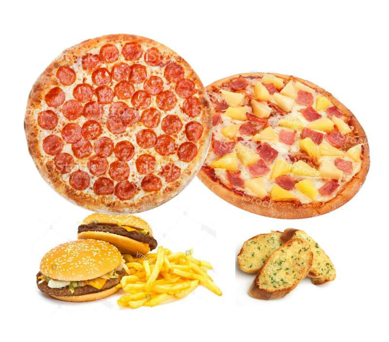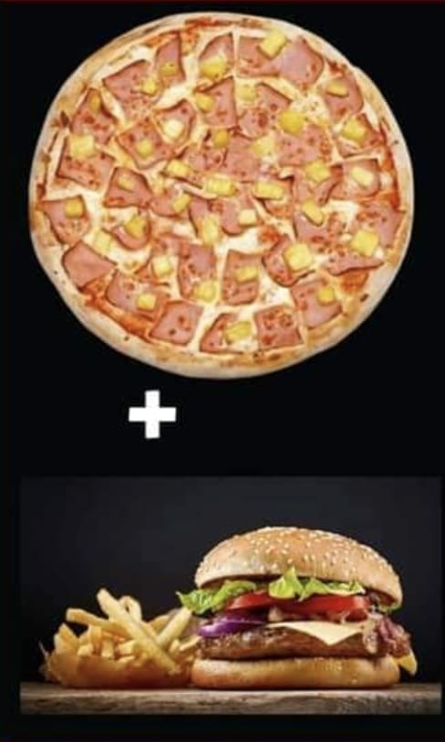 1 pizza, ( dos ingredientes a elegir) 2 hamburguesas (con papas y queso)