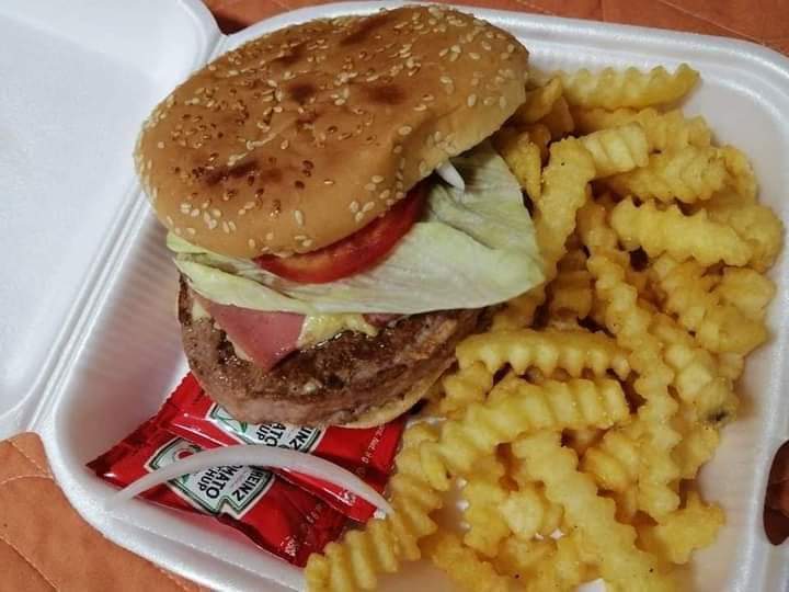 1 hamburguesas con papas fritas y 1 pizza grande ( 3 ingredientes a escoger )