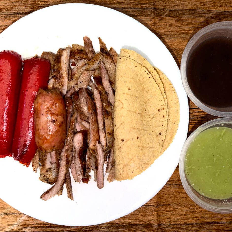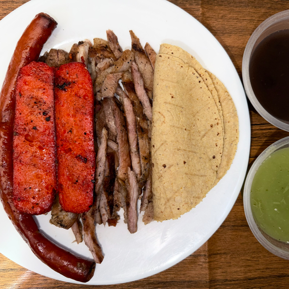 150 grs. de carne asada + 1 pieza de salchicha parrillera + 2 piezas de chorizo argentino + 1 pepsi de 355 mls. acompañado de tortillas, frijoles negros y salsa verde.