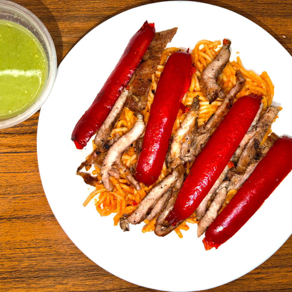 Orden de 200 grs. de espagueti rojo + 50 gramos de carne asada + 1 pieza de salchicha parrillera + 1 pepsi de 355 mls. acompañado de salsa verde y tortillas.