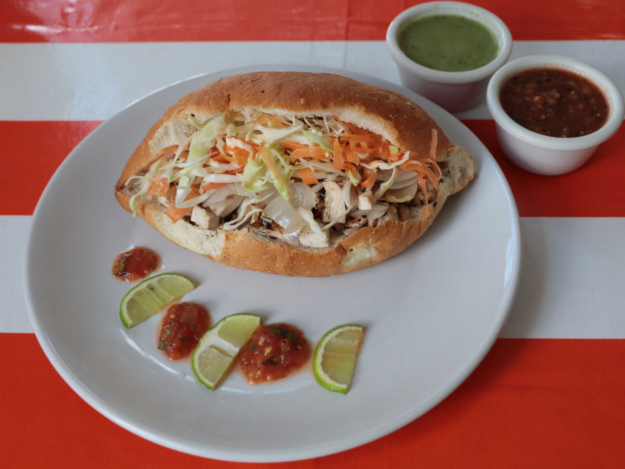 Deliciosa pechuga de pollo asado, cebolla asada, repollo y frijol, incluye: salsa de chiltomate o verde.