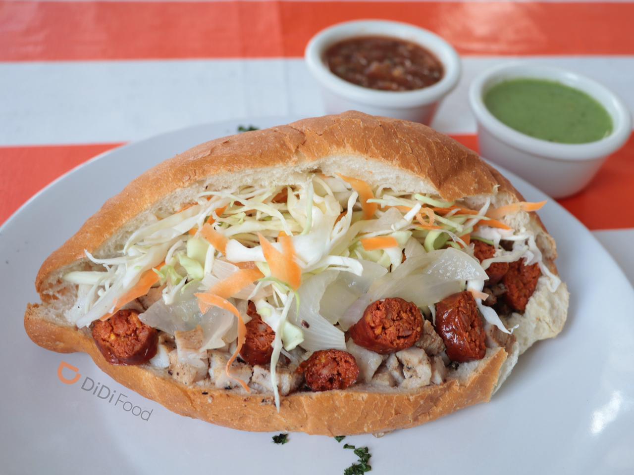 La torta lleva chorizo casero asado, cebolla asada, repollo y frijol, incluye: salsa de chiltomate o verde.