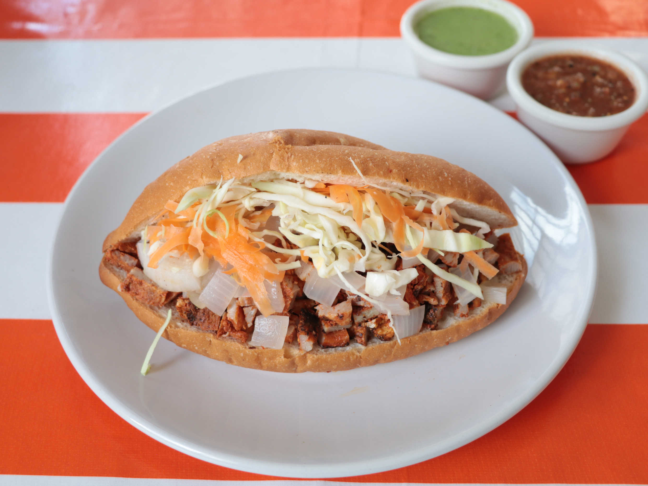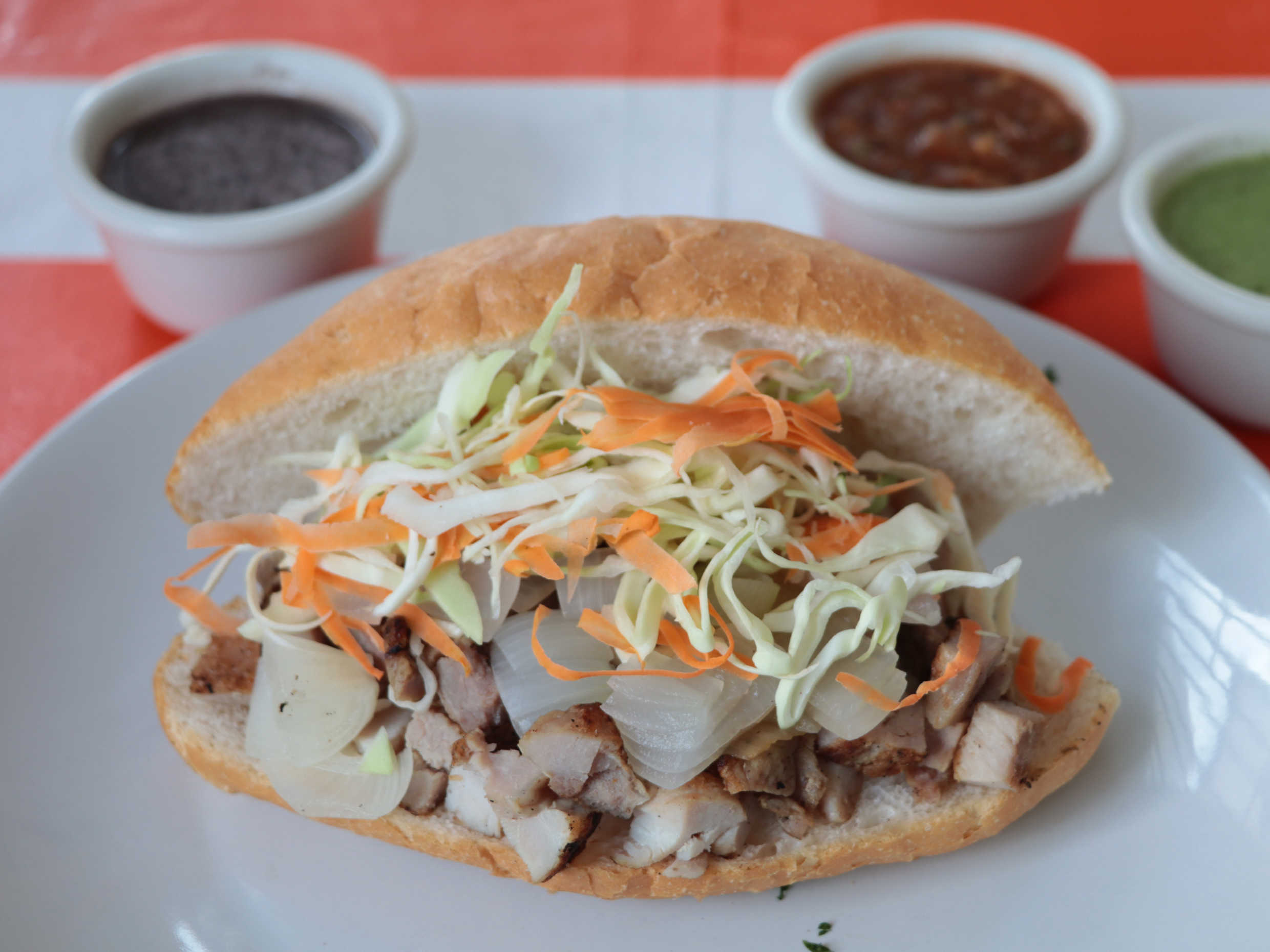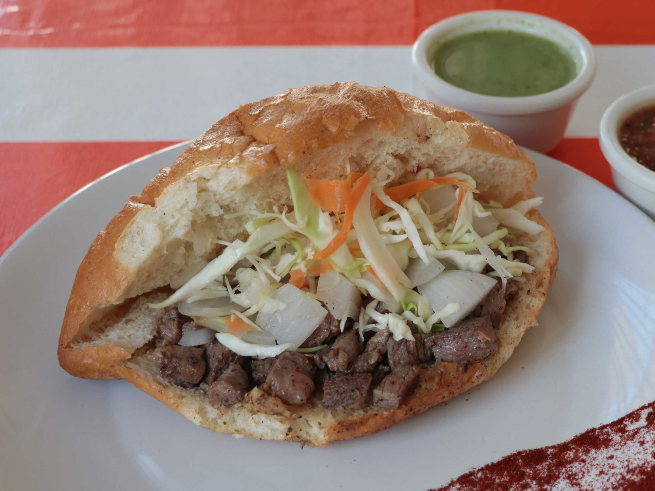 La torta lleva: arrachera, cebolla asada, col, frijol. Incluye salsa de chiltomate o salsa verde.