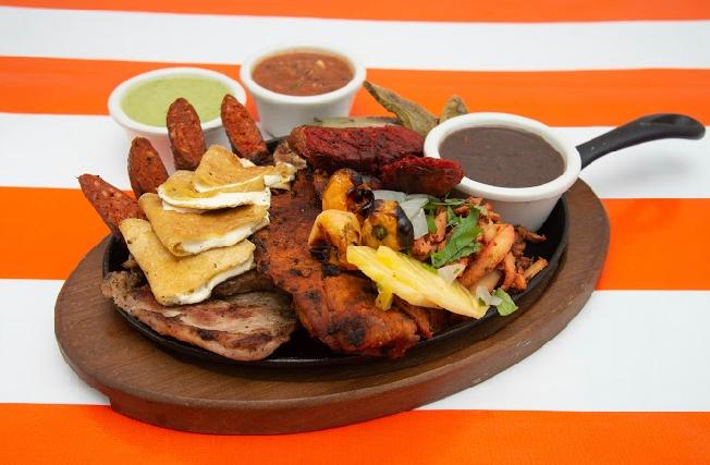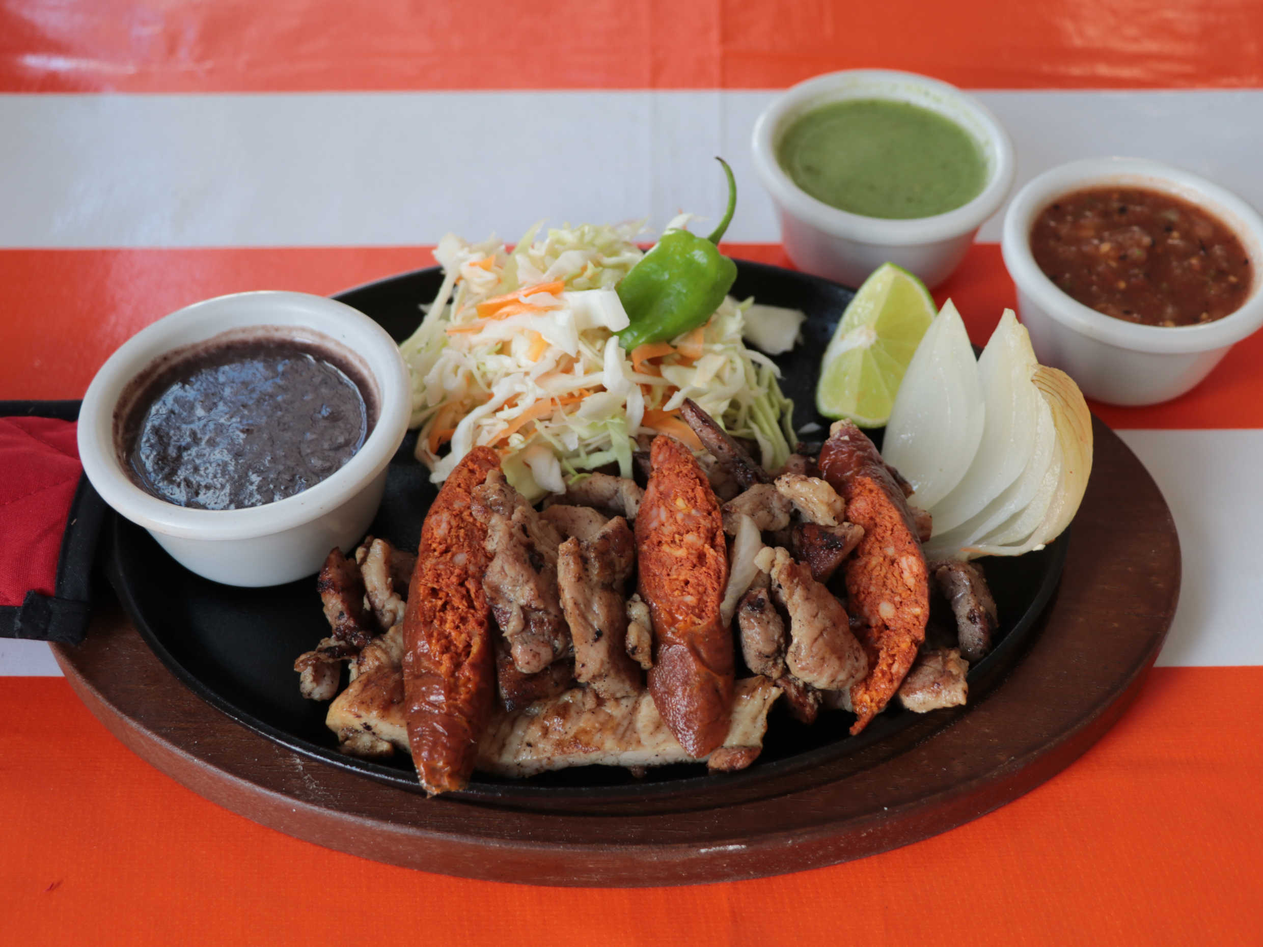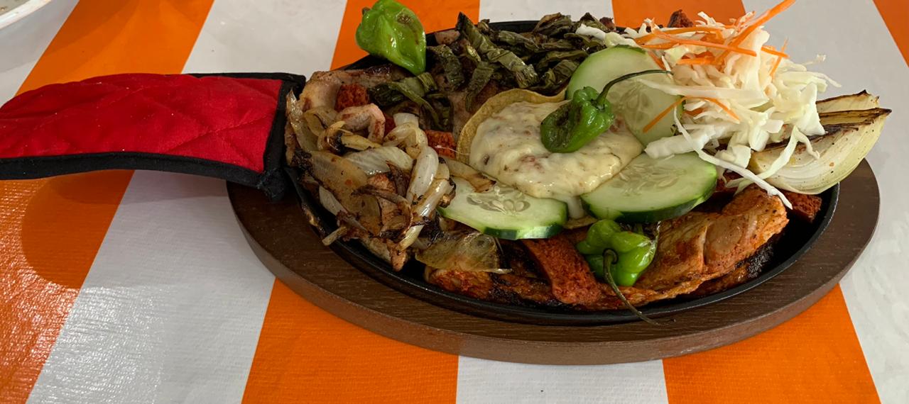 Carne de puerco, longaniza de Valladolid y cebolla asada al carbón, frijol, col, chiltomate o salsa verde, limón y tortillas.