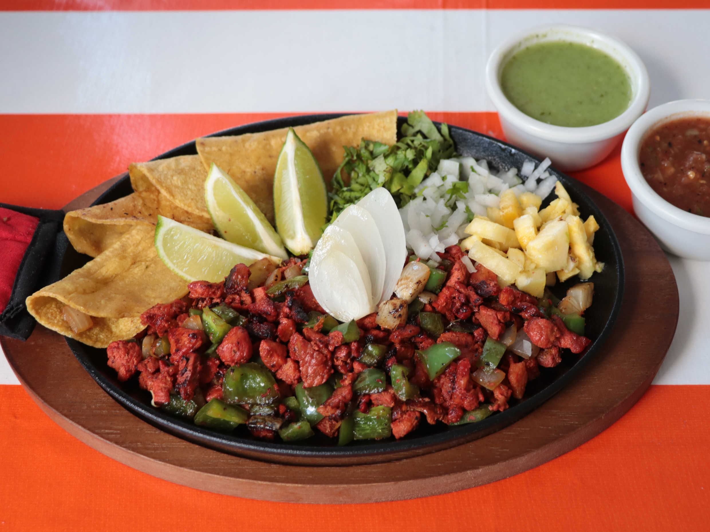 Carne de puerco al pastor con cebolla, morrón, queso, acompañado de cebolla, cilantro y piña, salsa, tortillas y limón.
