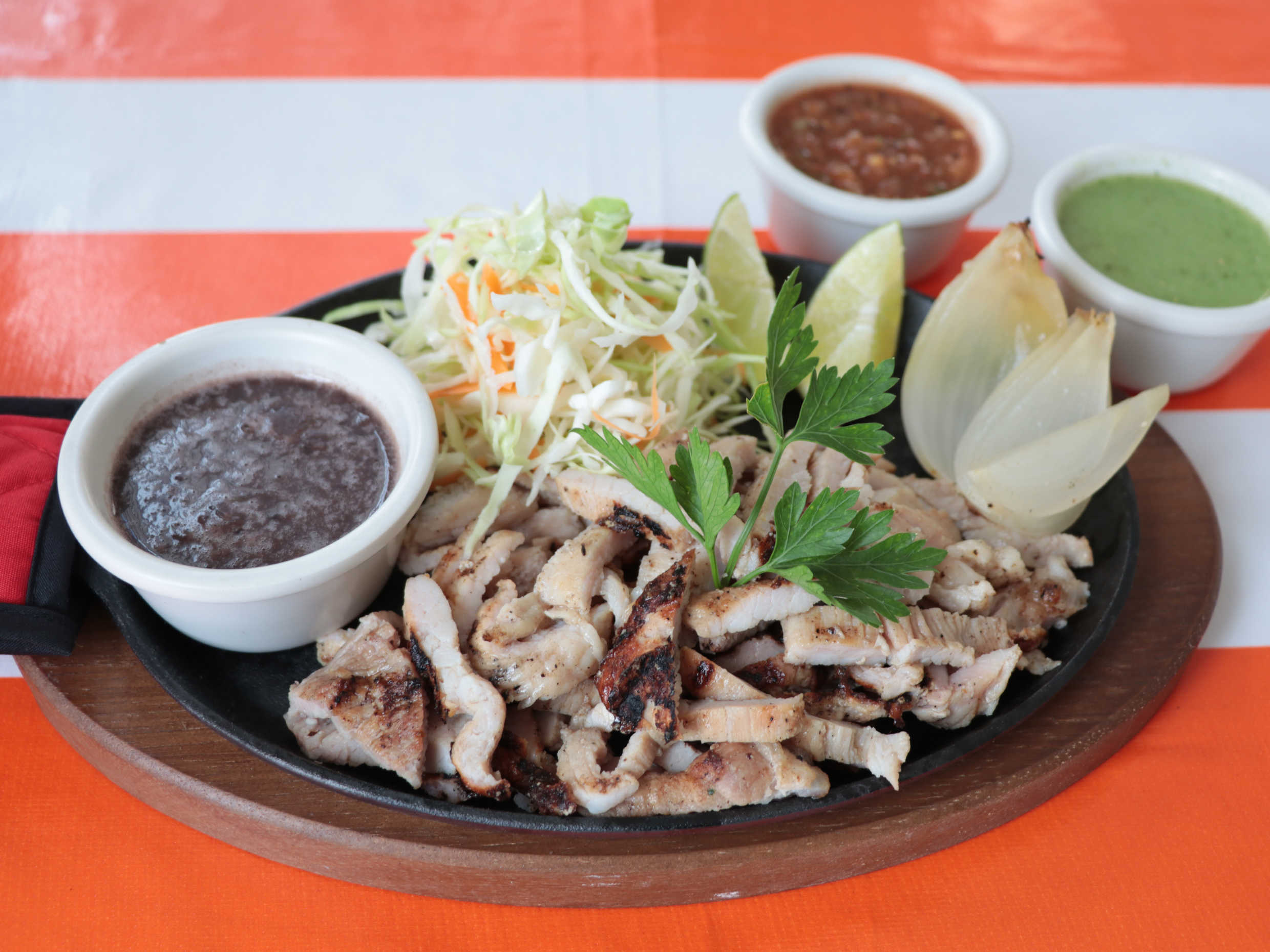 El kilo incluye: salsa, cebolla asada, limones, ensalada de col y frijoles.