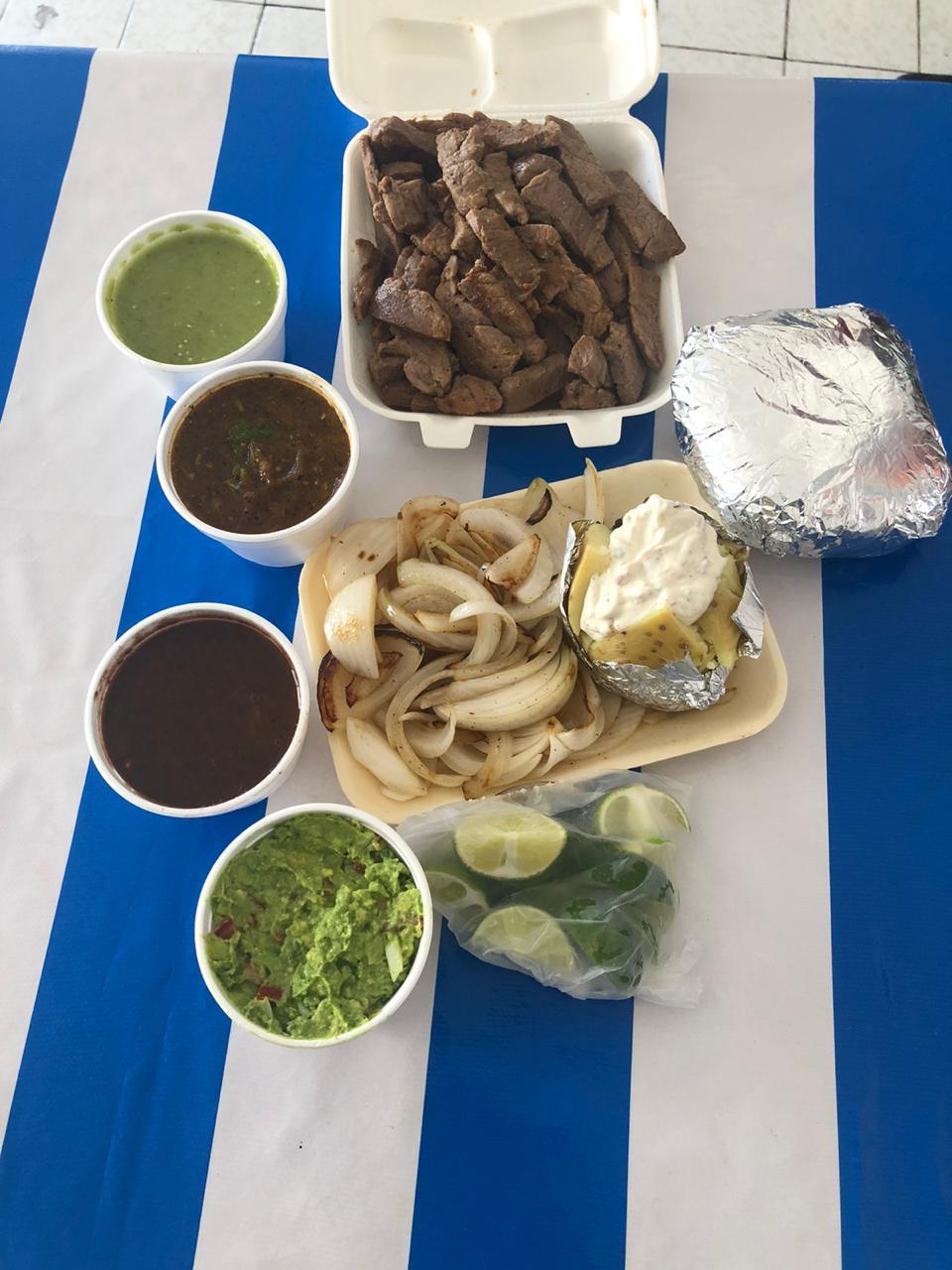 El kilo de arrachera incluye: salsa, cebolla asada, limones, frijoles, tortillas y guacamole.
