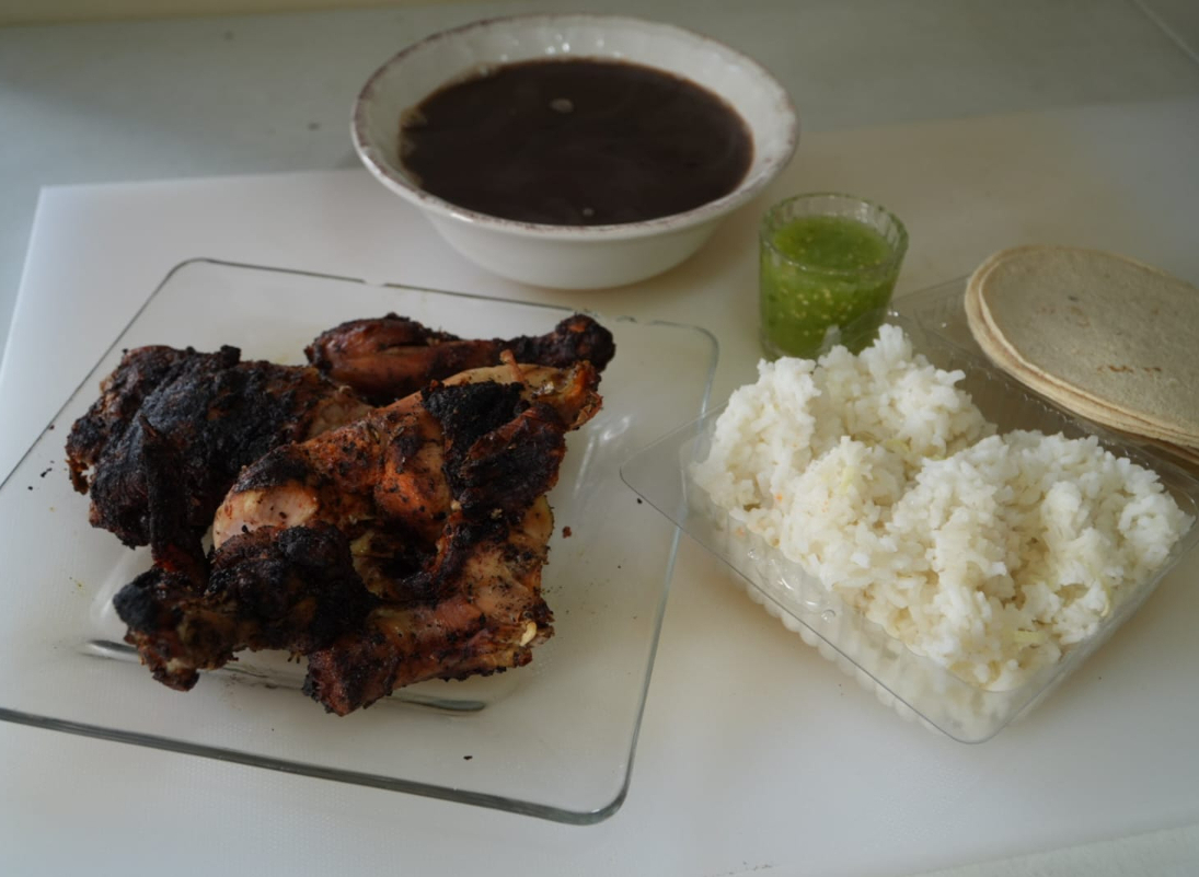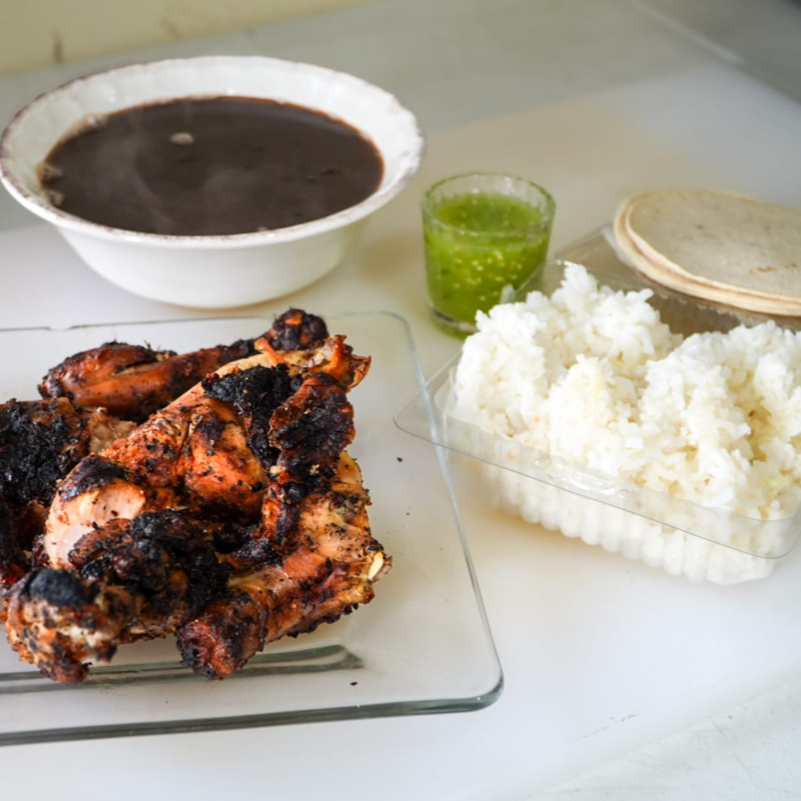 Un cuarto de pollo asado con acompañamientos, (incluye arroz, salsa verde, tortillas y frijoles).