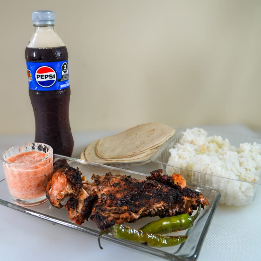 1/4 De pollo asado con acompañamientos (incluyen frijol, arroz, salsa, tortilla y Pepsi 400 ml).