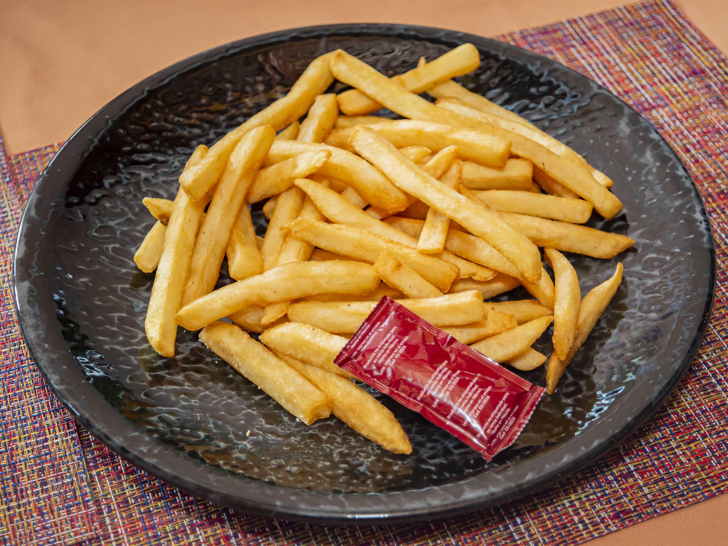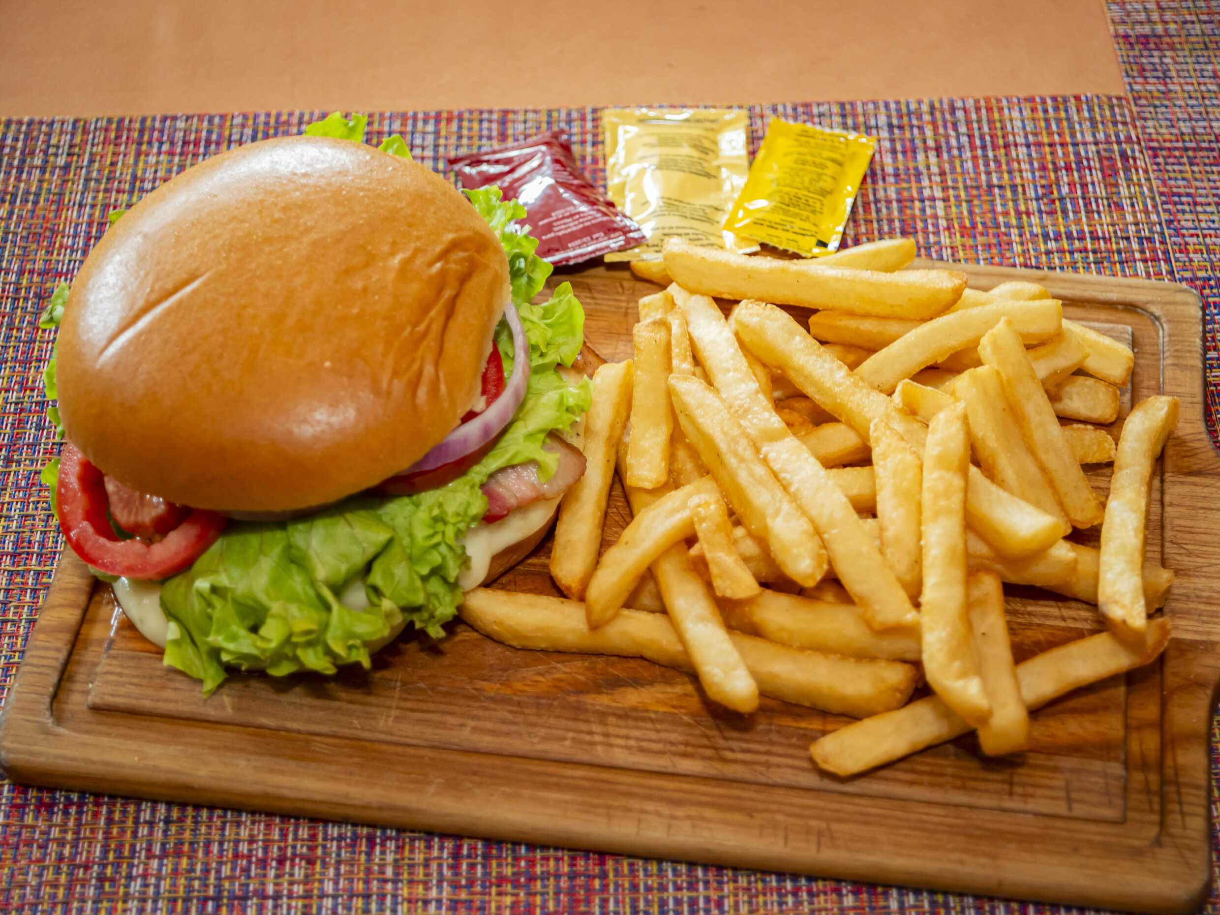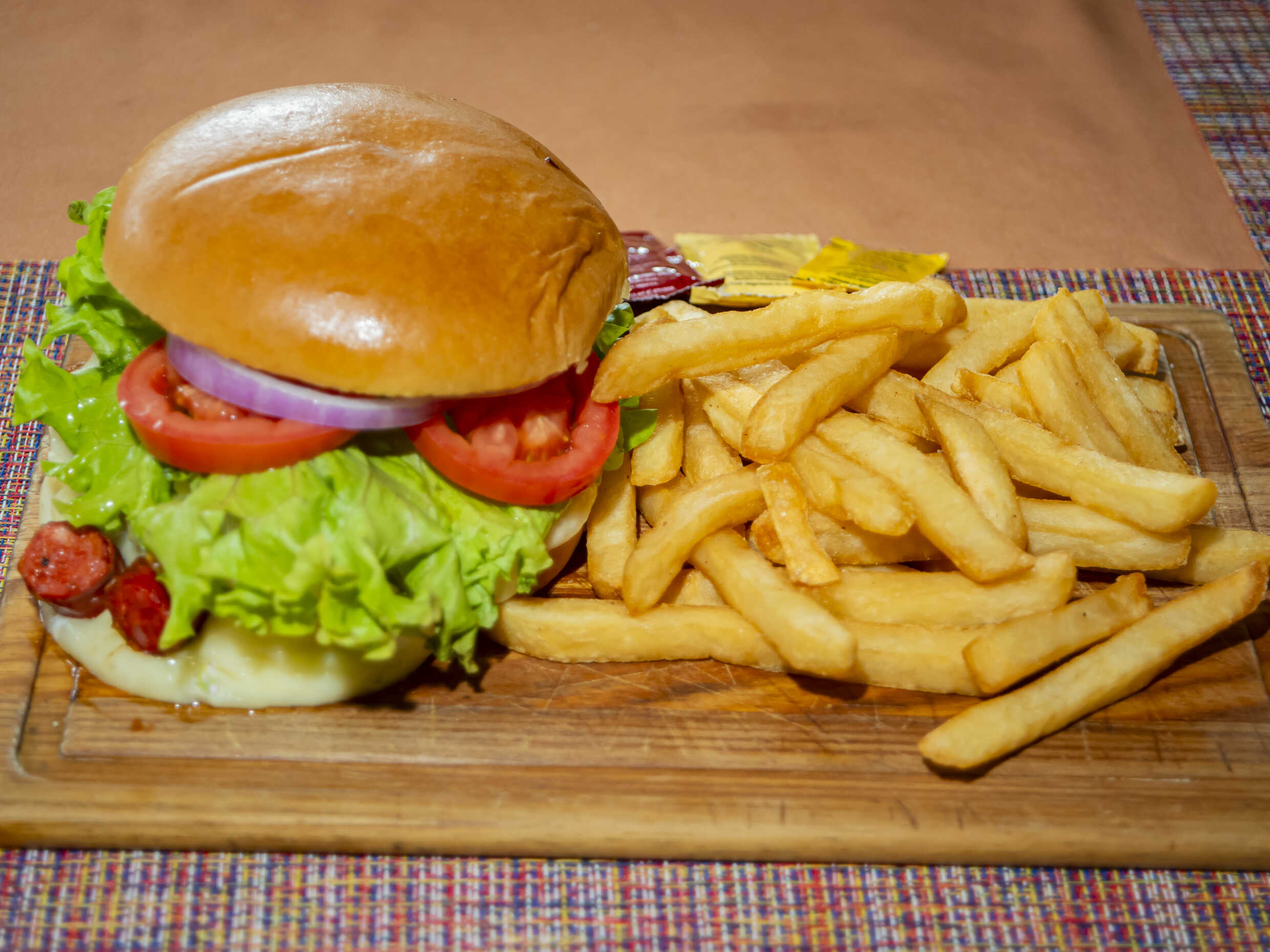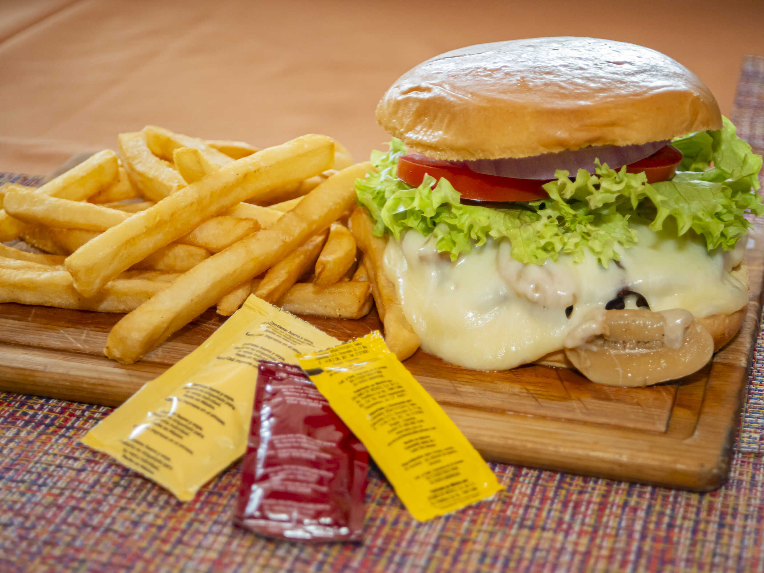 Con queso gouda fundido, acompañada de lechuga, tomate, cebolla y 200 g de papas a la francesa.