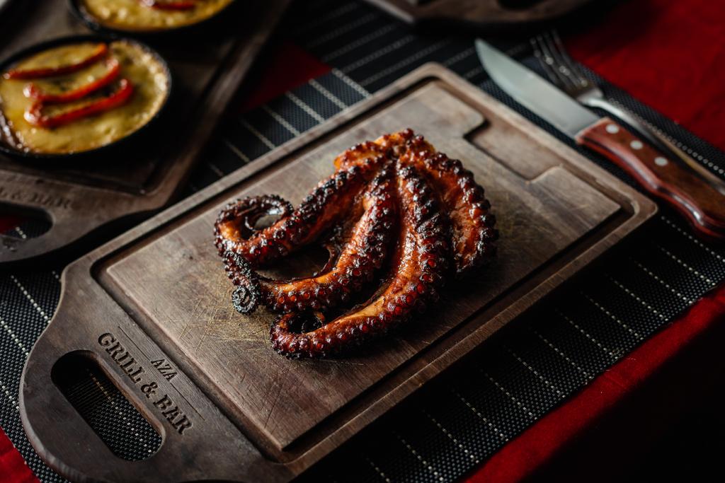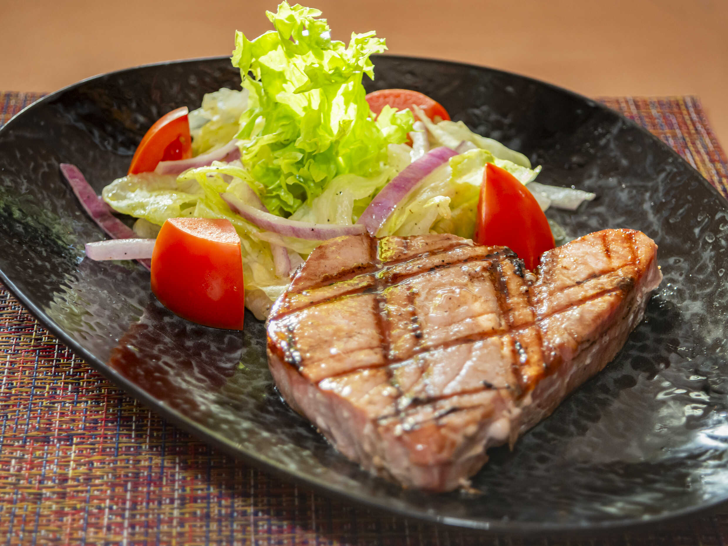 Delicioso atún importado, sellado a las brasas, acompañado de verduras salteadas al momento y una salsa receta de aza grill.