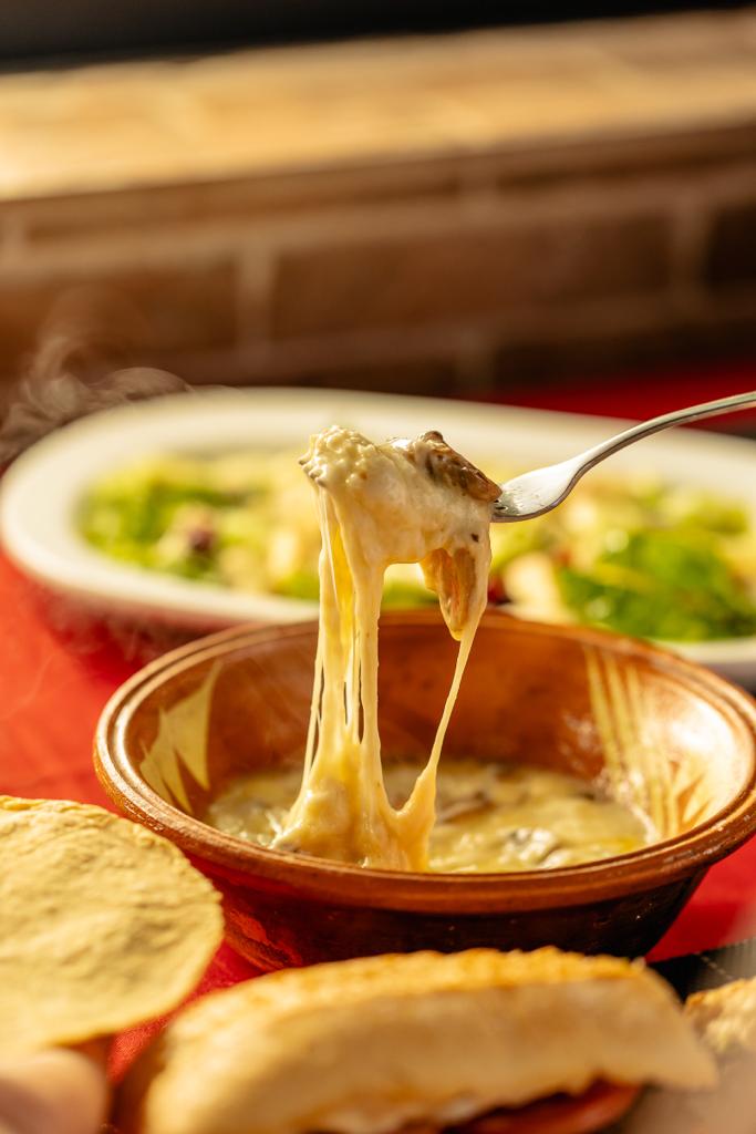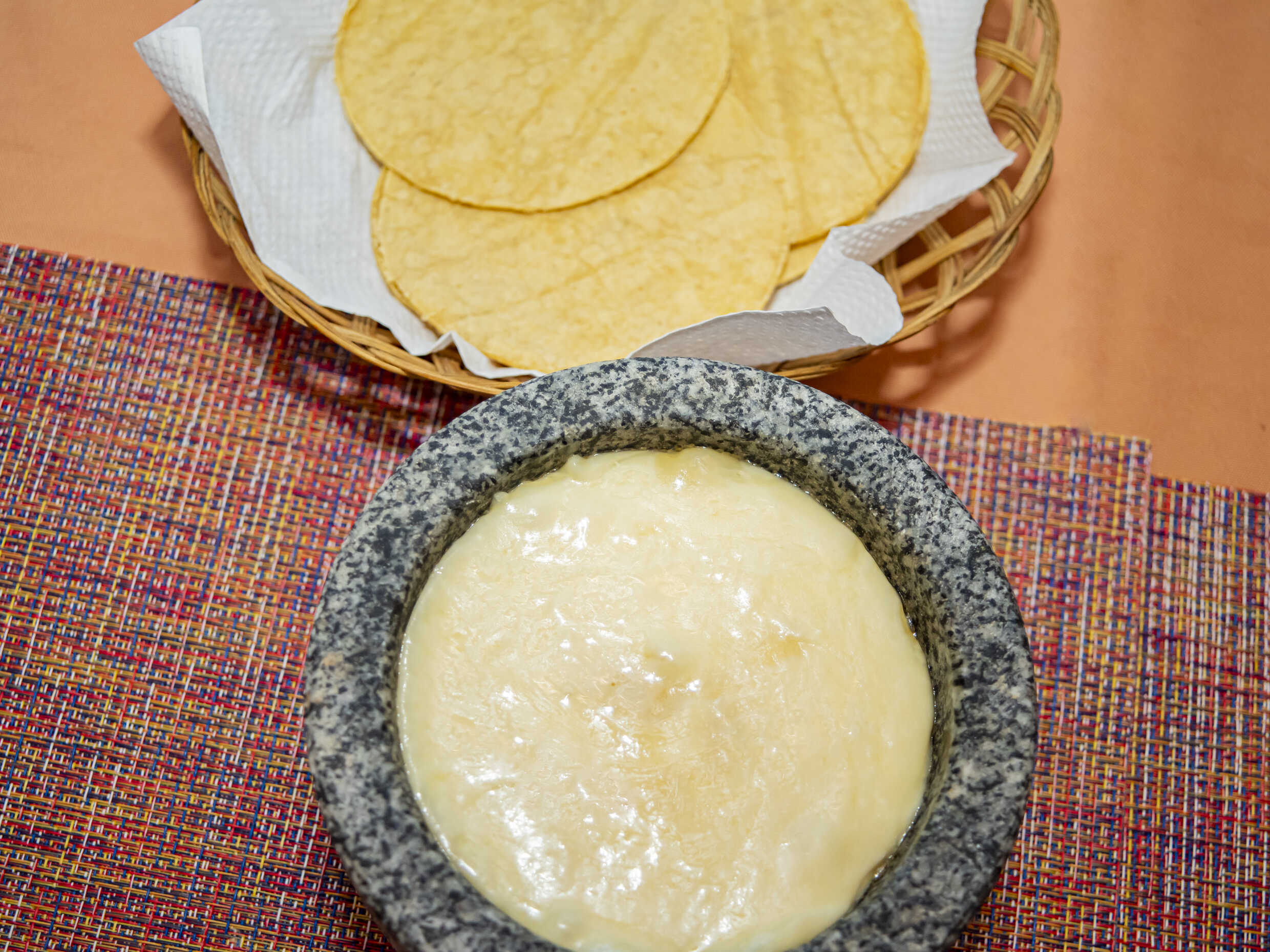 Queso gouda fundido, acompañado de tortillas de maíz o harina.