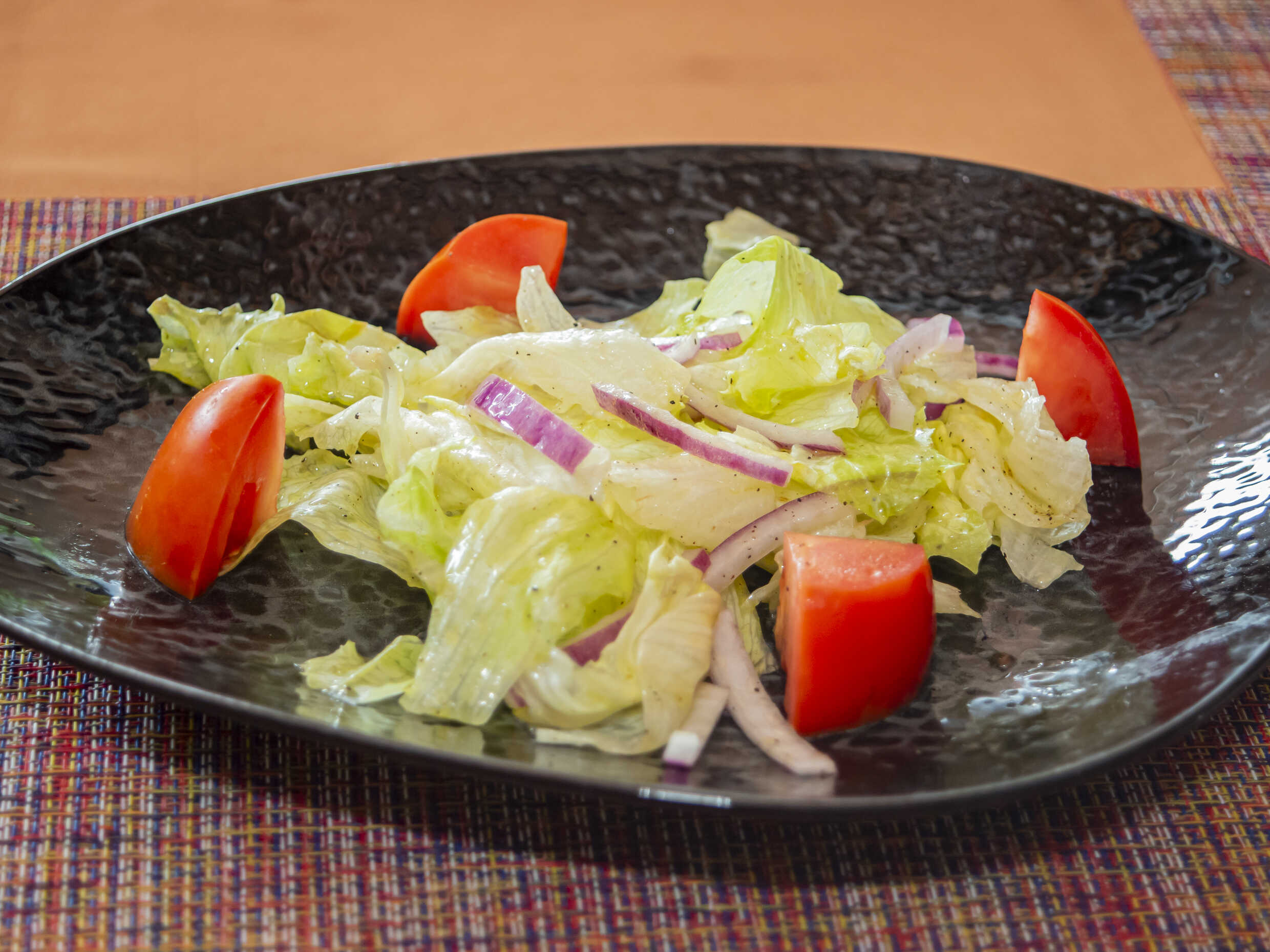 Lechuga romana, tomate y cebolla con una vinagreta natural elaborada al momento.