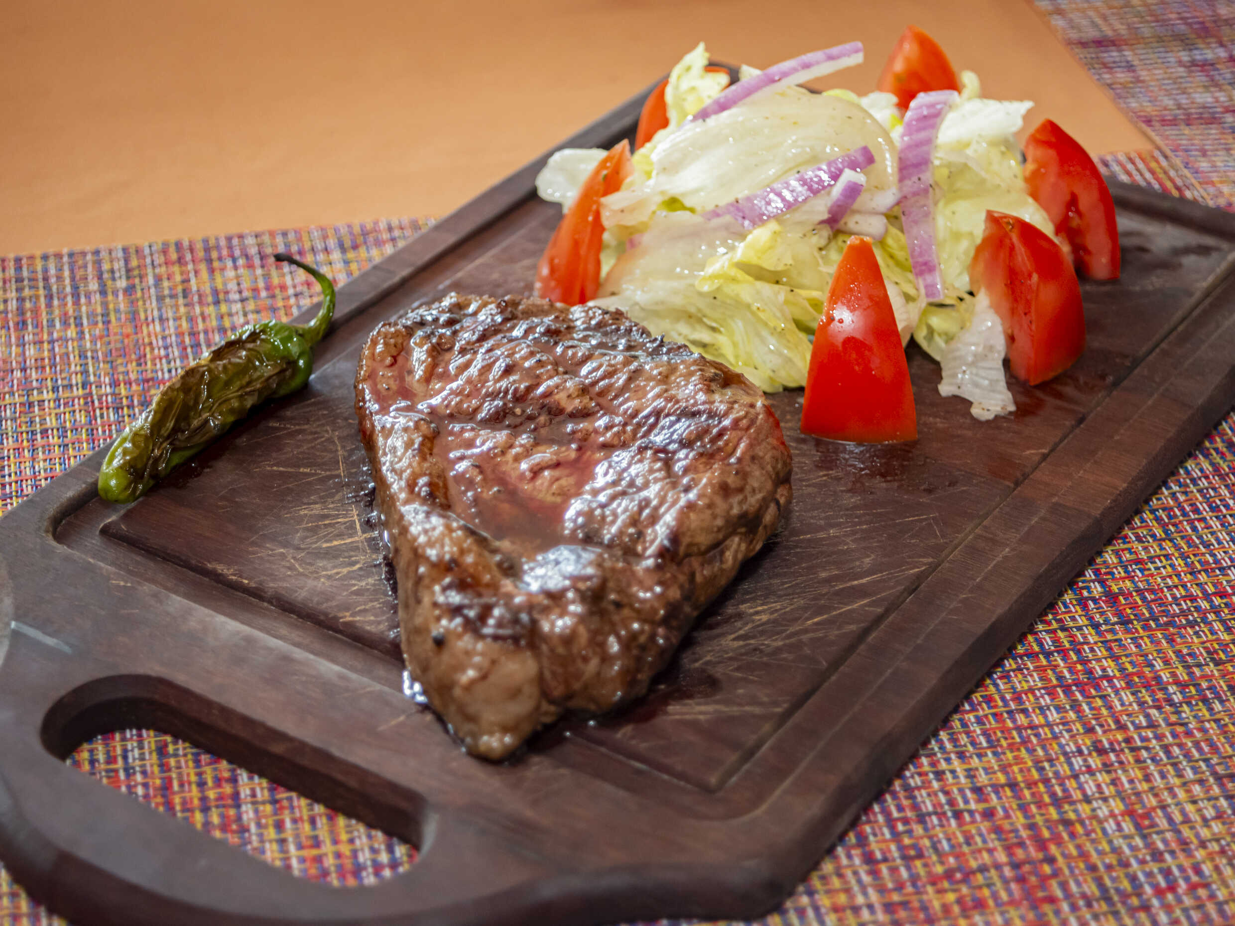 Corte con marmoleo perfecto, todos los cortes son acompañados de una guarnición de ensalada mixta y chile toreado, lechuga romana, cebolla y tomate con una vinagreta natural preparada al momento.