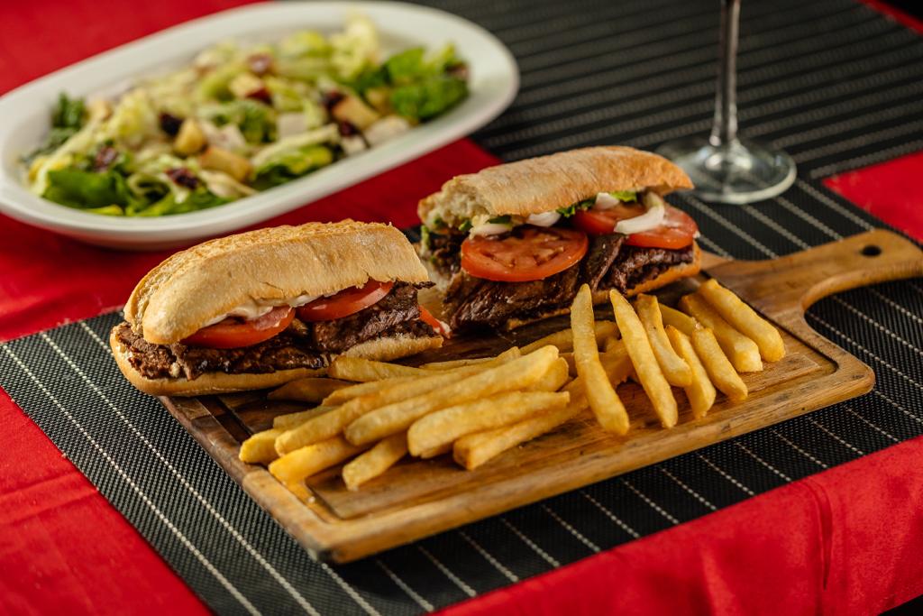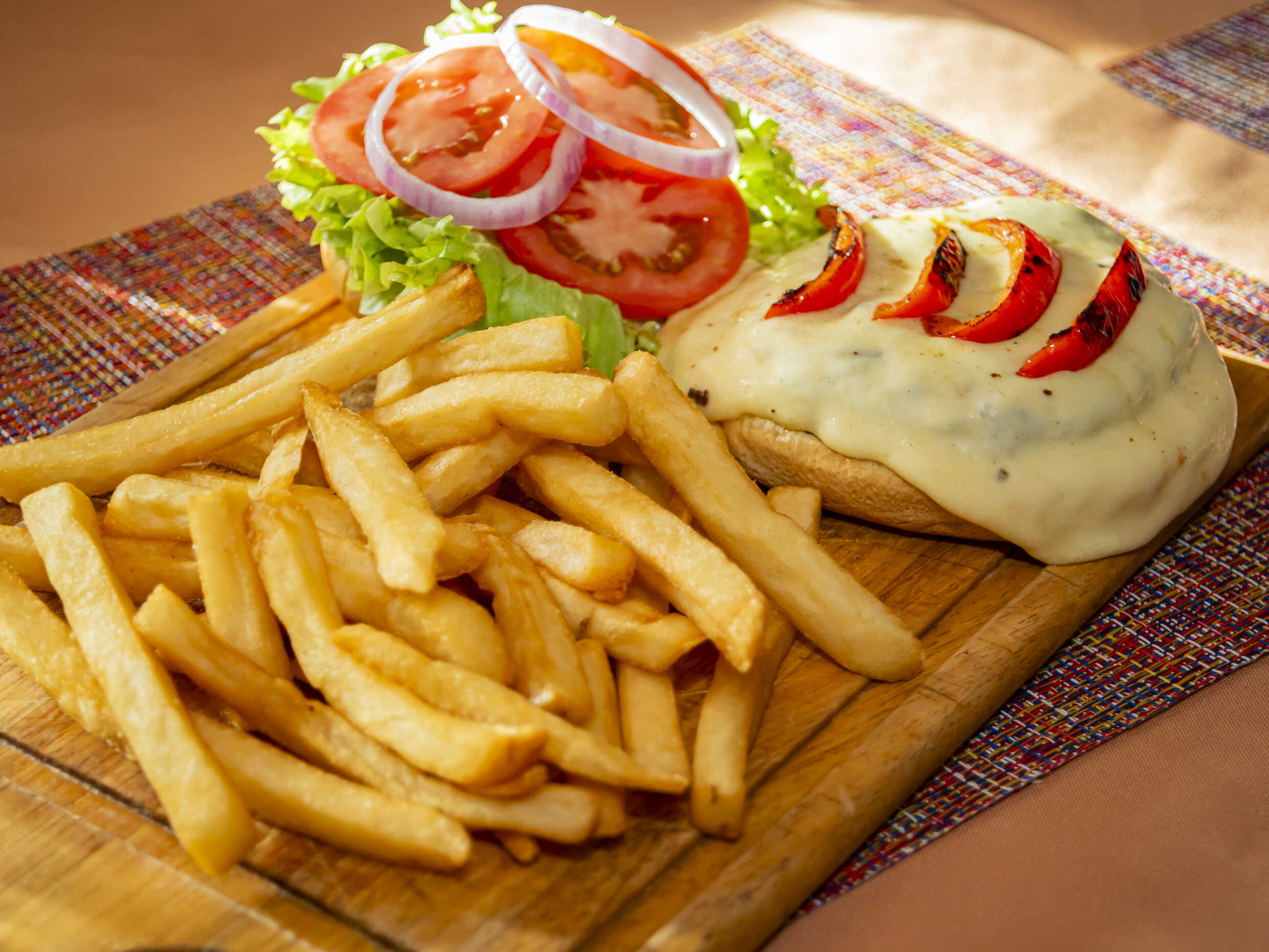 Con queso provolone ahumado y pimiento morrón natural y asado, acompañada de lechuga, tomate, cebolla y 200 g de papas a la francesa.