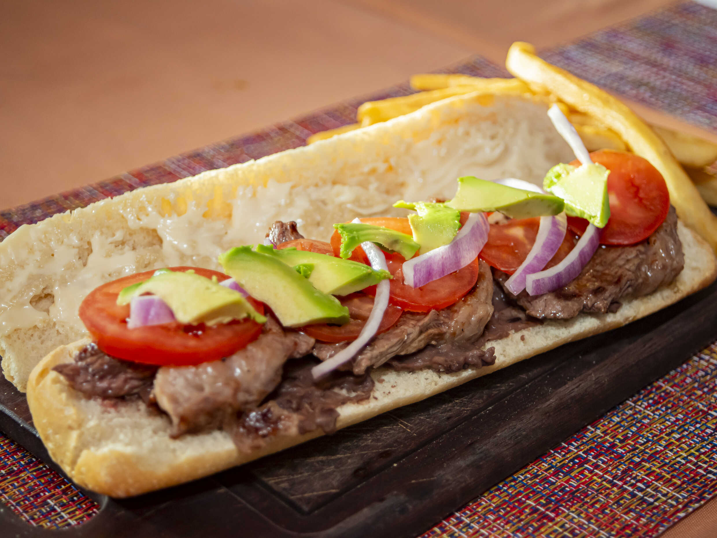 Frijol, mayonesa, carne, aguacate, tomate y cebolla, con papas.