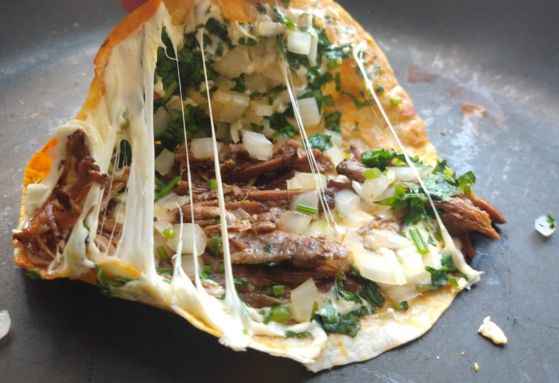 Una tortilla de harina rellena de carne y queso oaxaca bien derretido