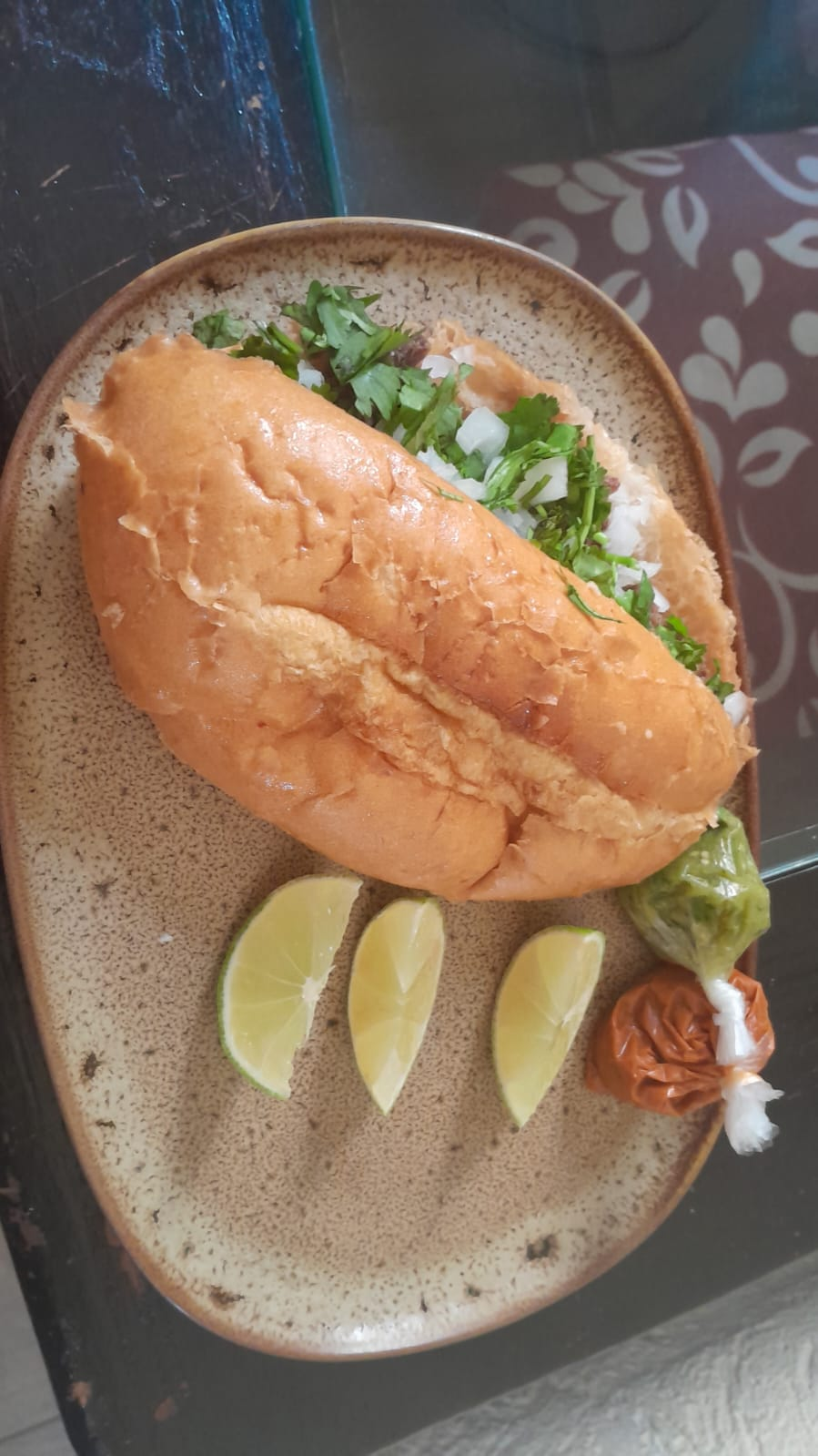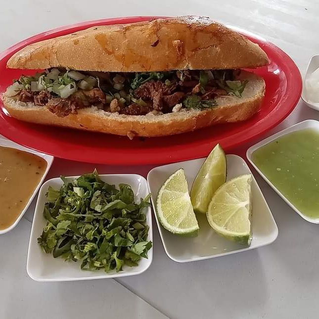 Bolillo tamaño regular, con Barbacoa cebolla cilatro y salsa